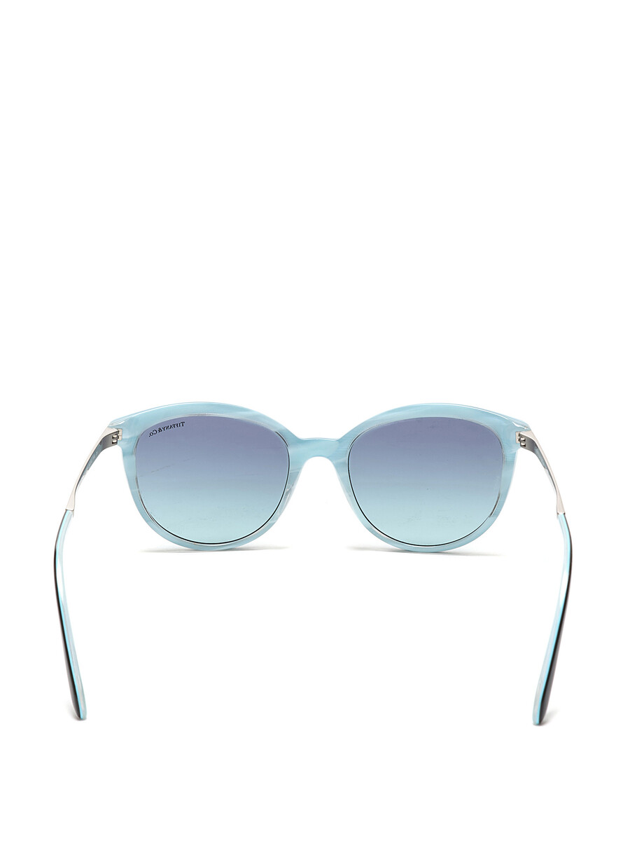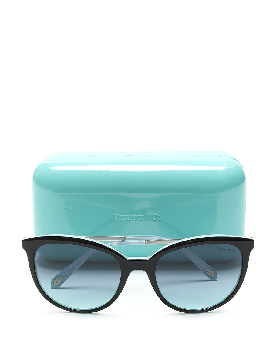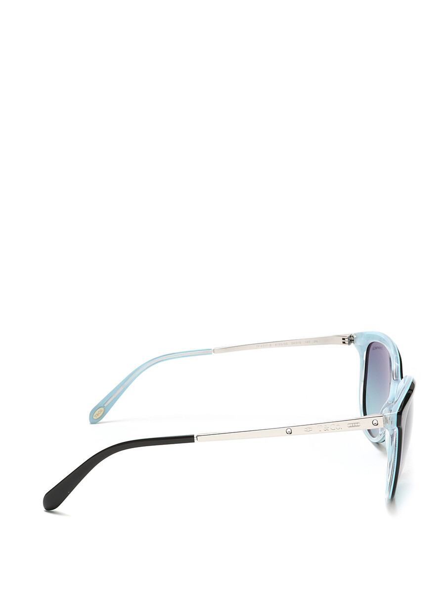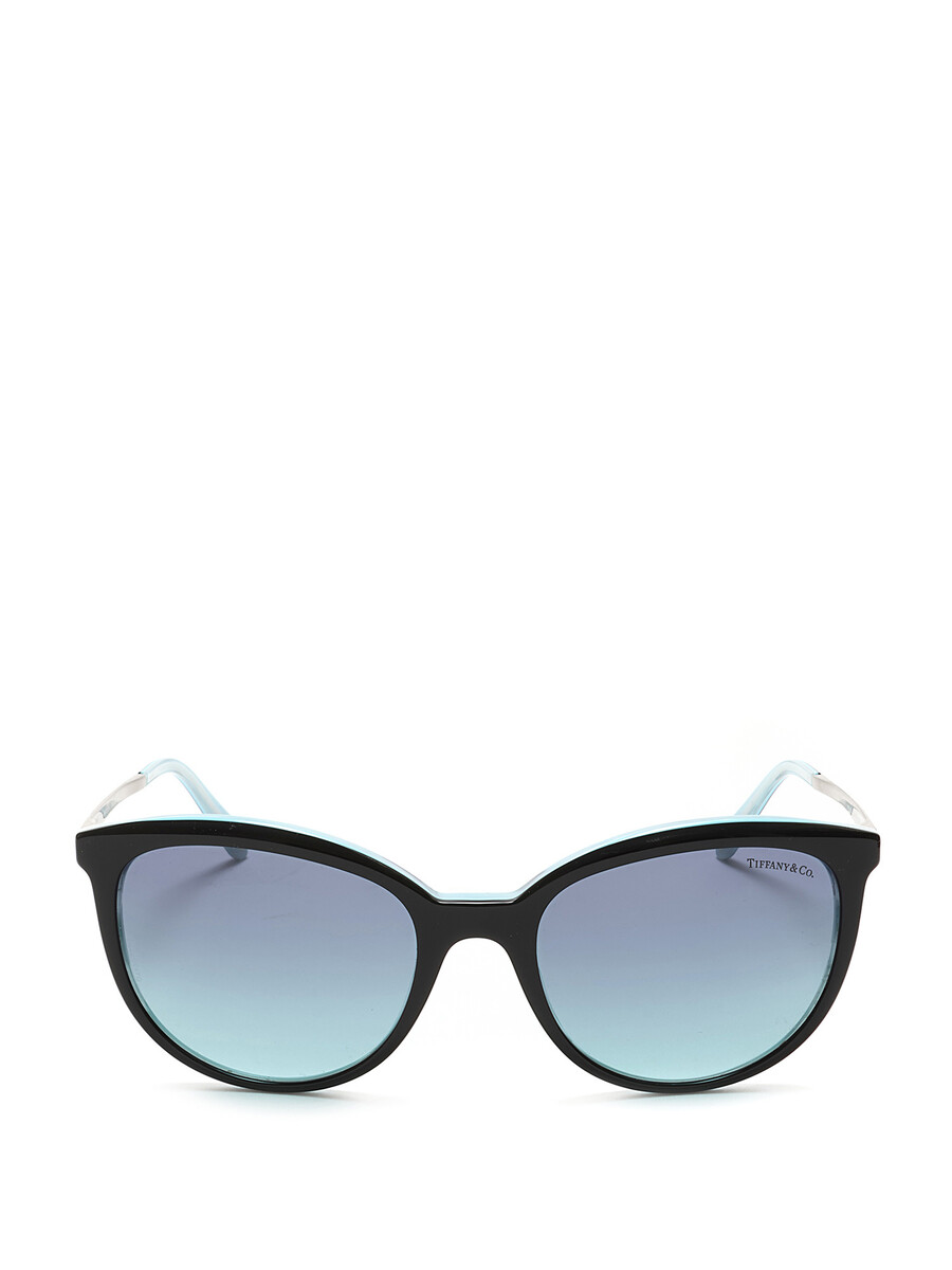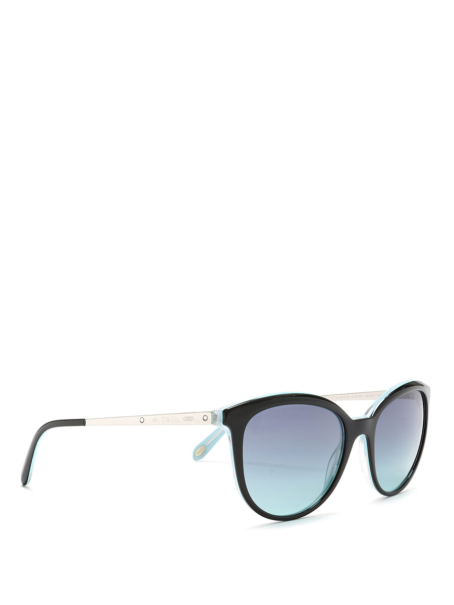 Acetate sunglasses featuring black and blue frames with silver-tone arms. Includes protective case.