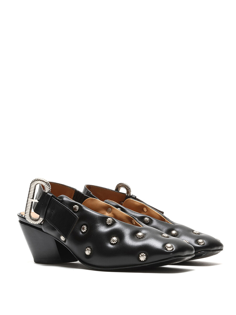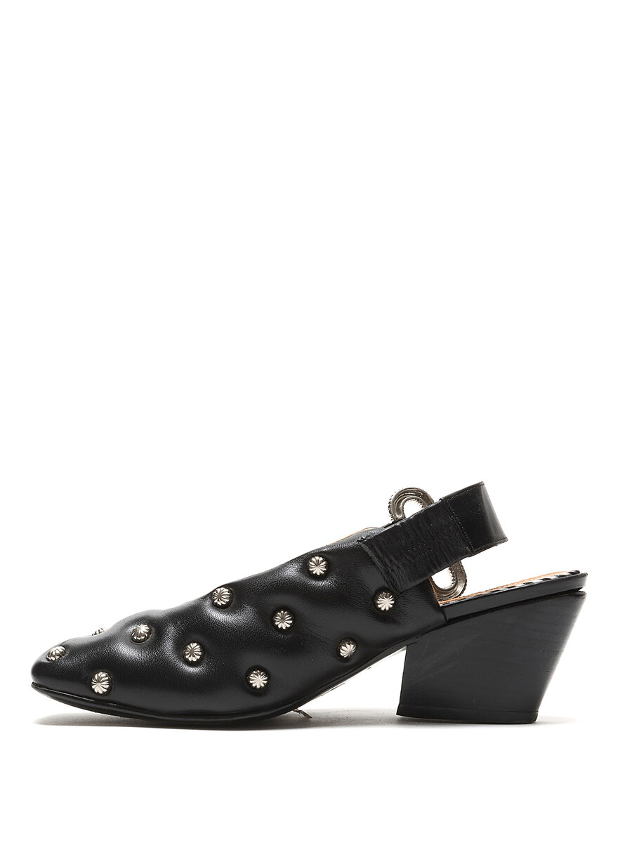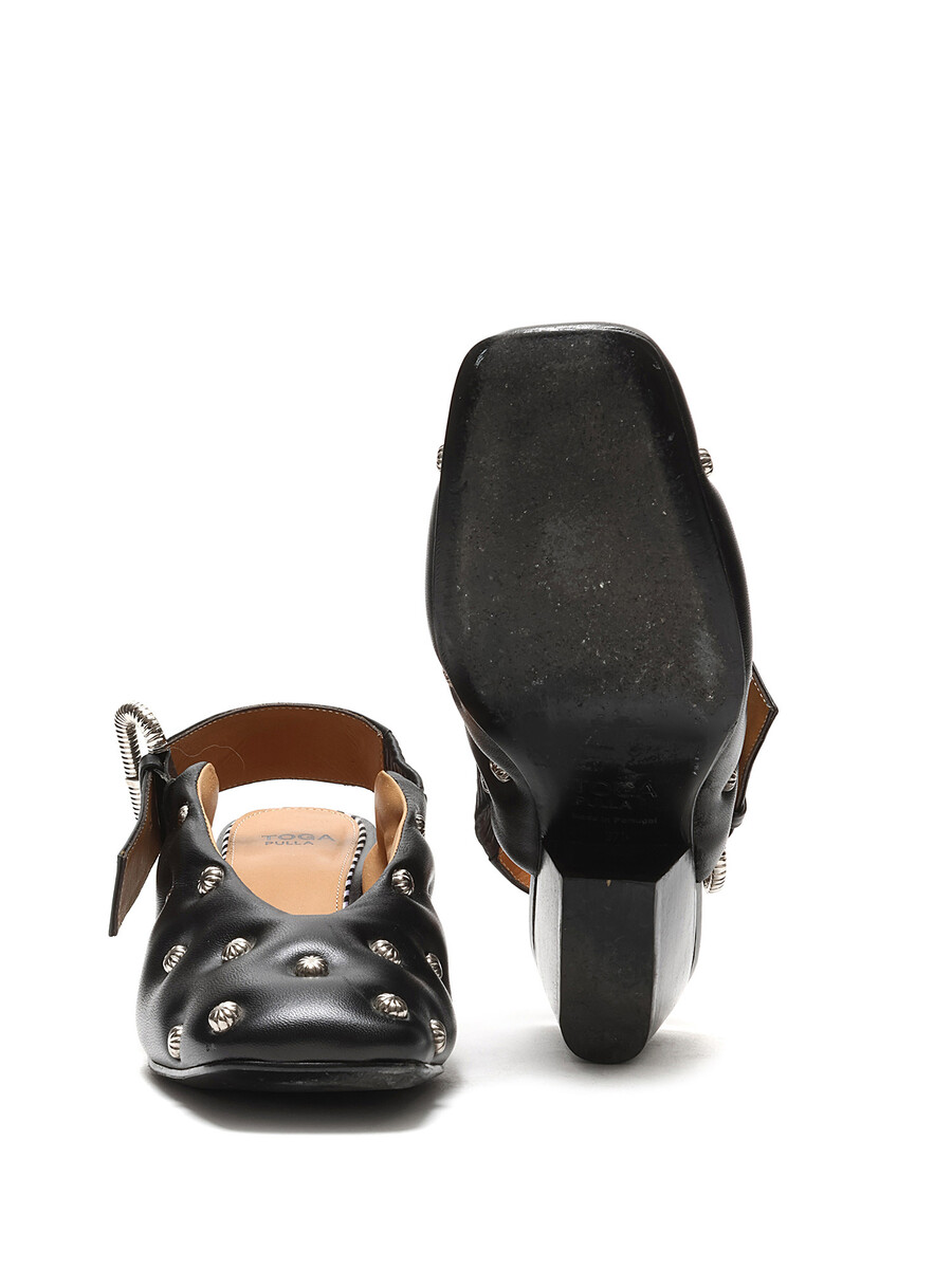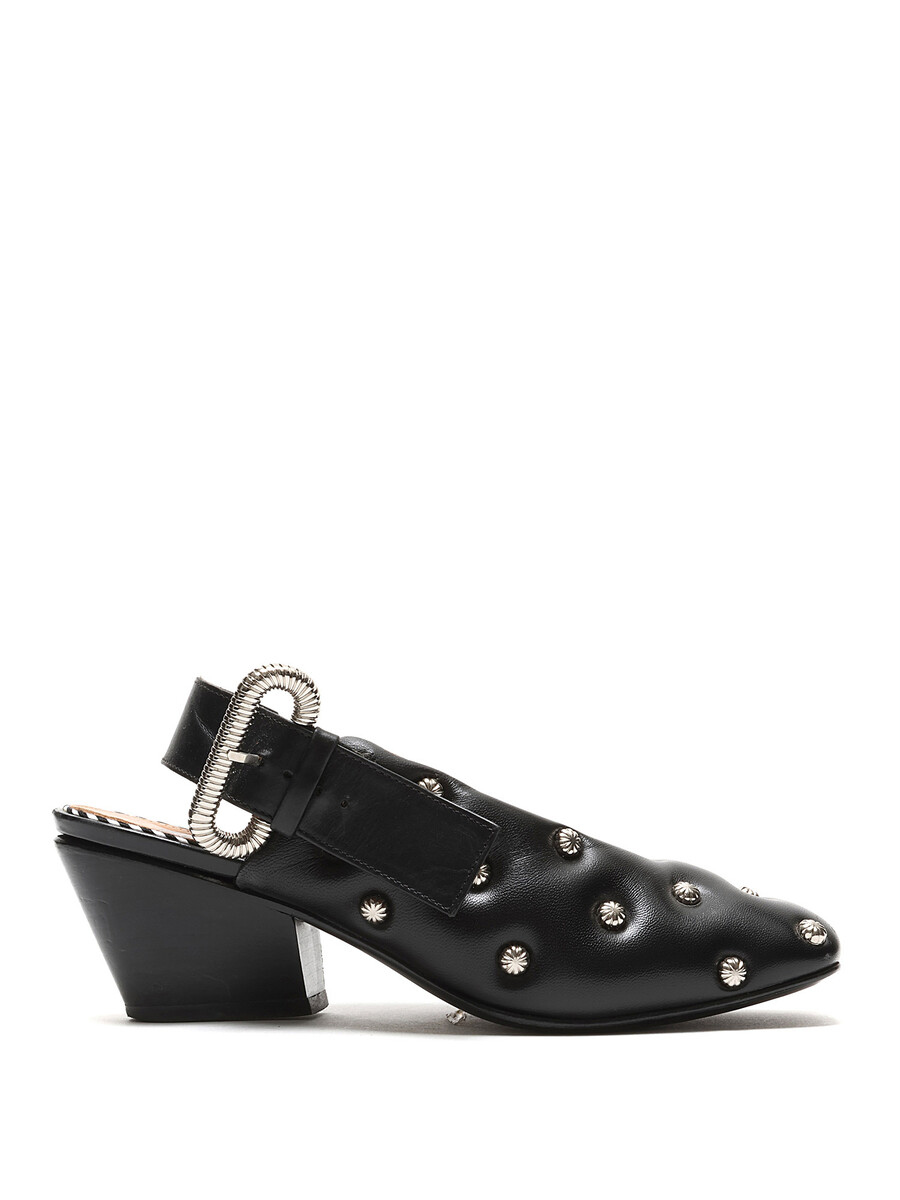 Quilted leather slingback heels in black with metal stud detailing. Square toe and buckle fastening. Leather sole.
