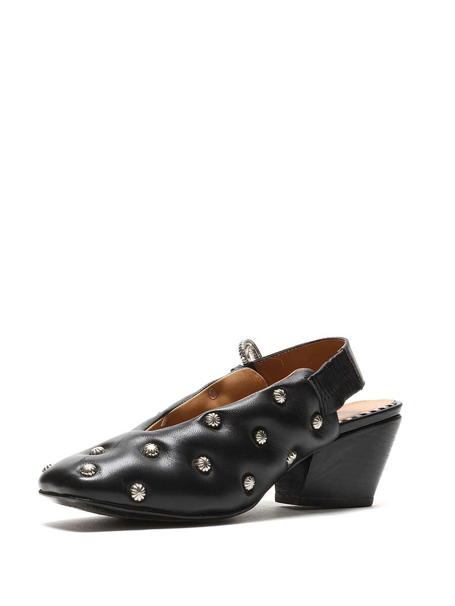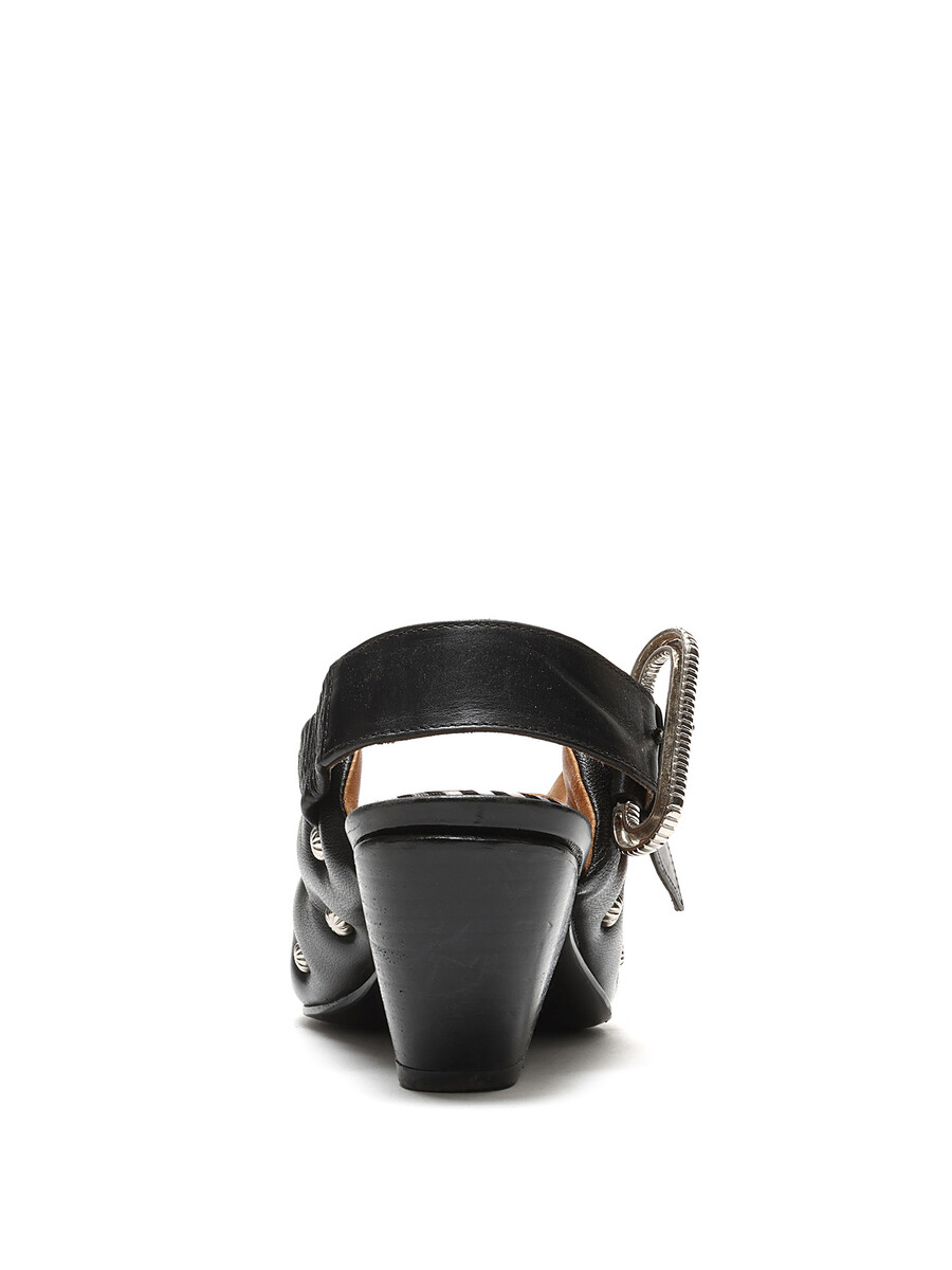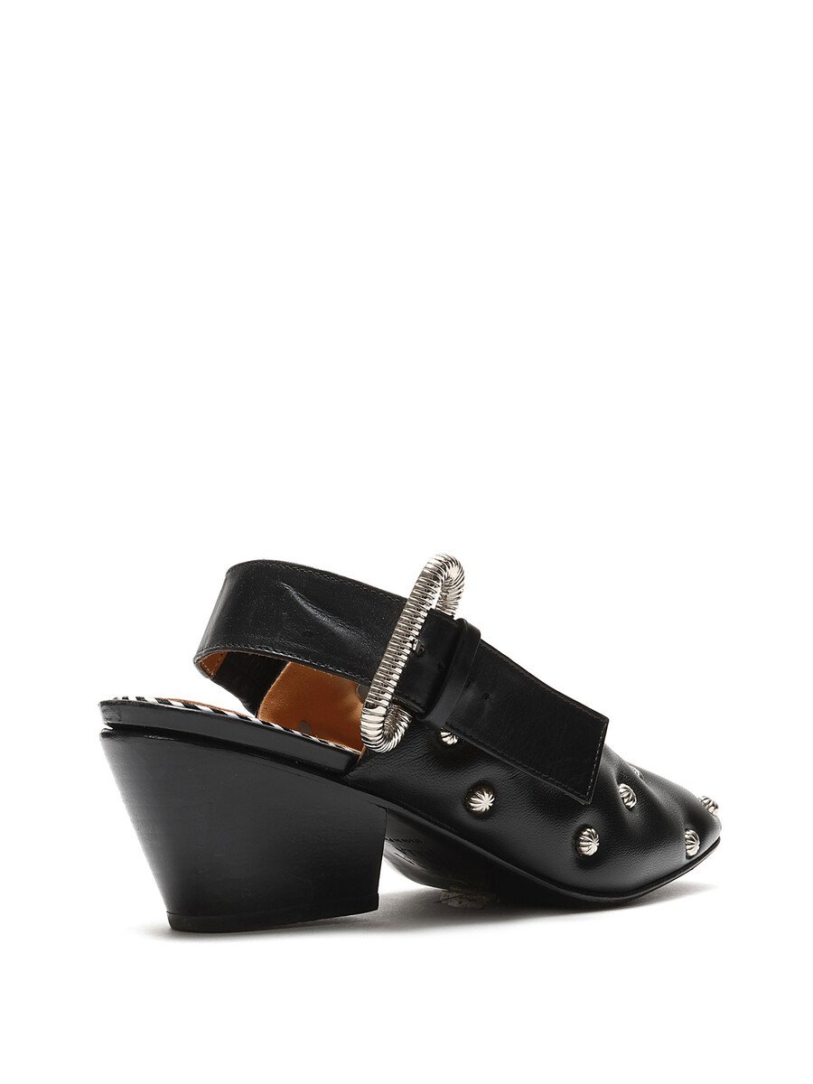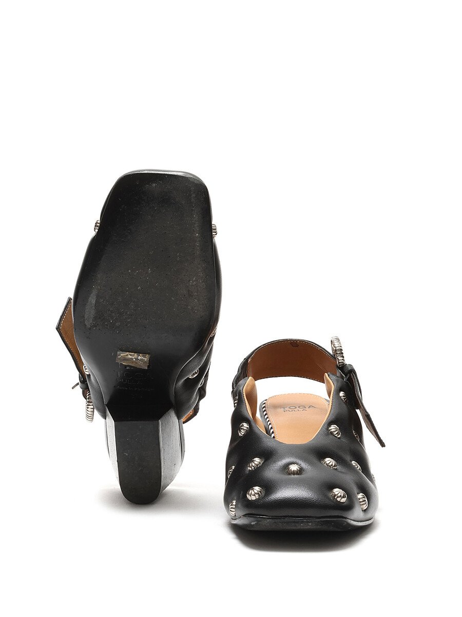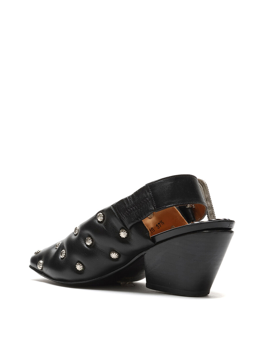 Quilted leather slingback heels in black with metal stud detailing. Square toe and buckle fastening. Leather sole.