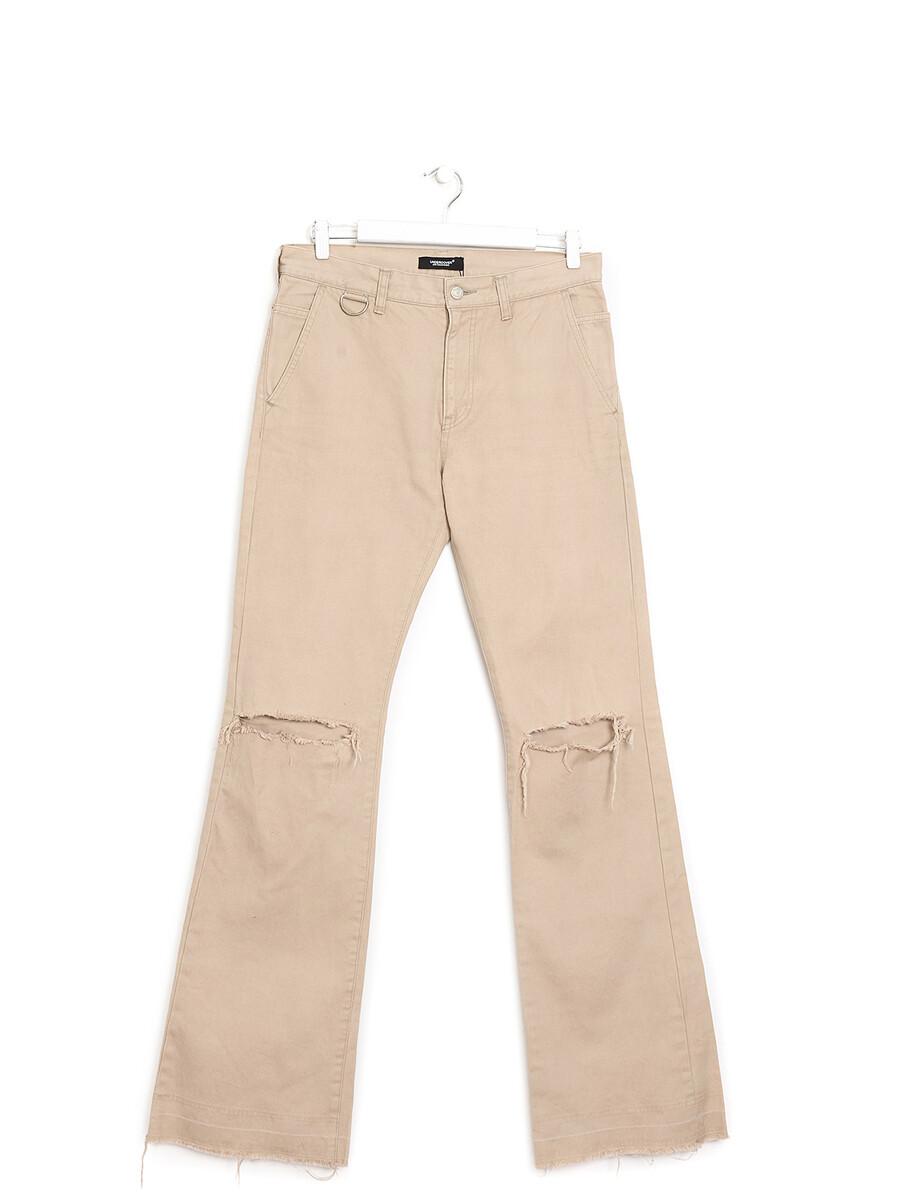 Distressed-effect beige cotton trousers featuring D-ring detail. Four pocket styling. Moderate fade to hardware and hems, with visible wear to edges.