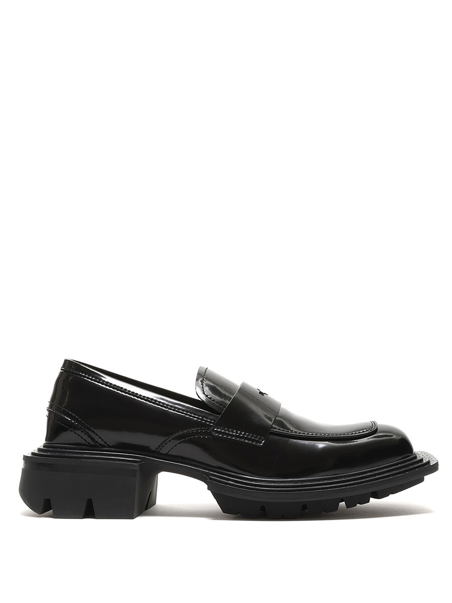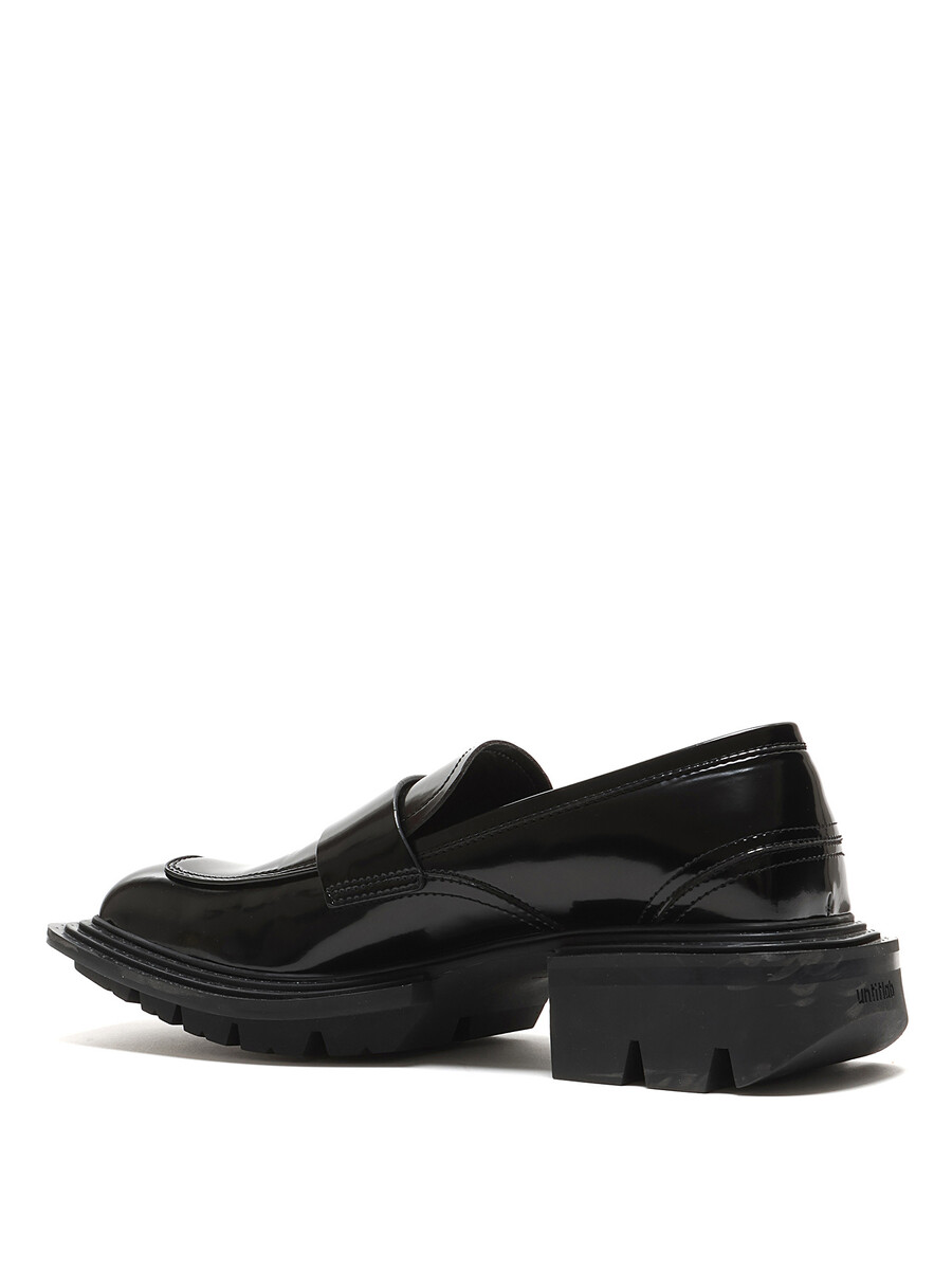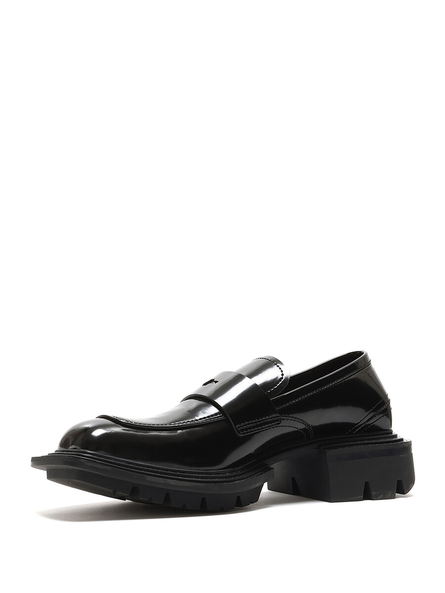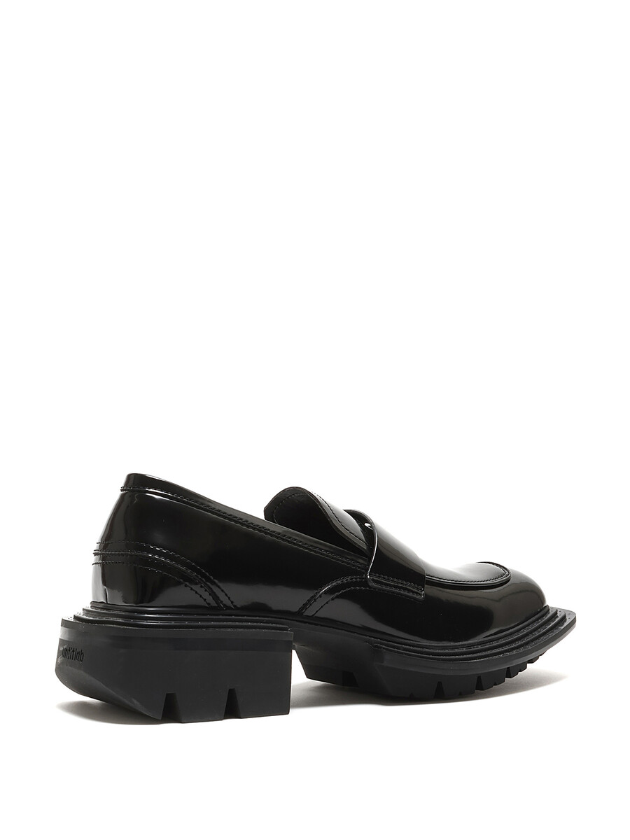 Black leather loafers with tonal stitching and a square closed toe. Treaded rubber sole. Comes with box.