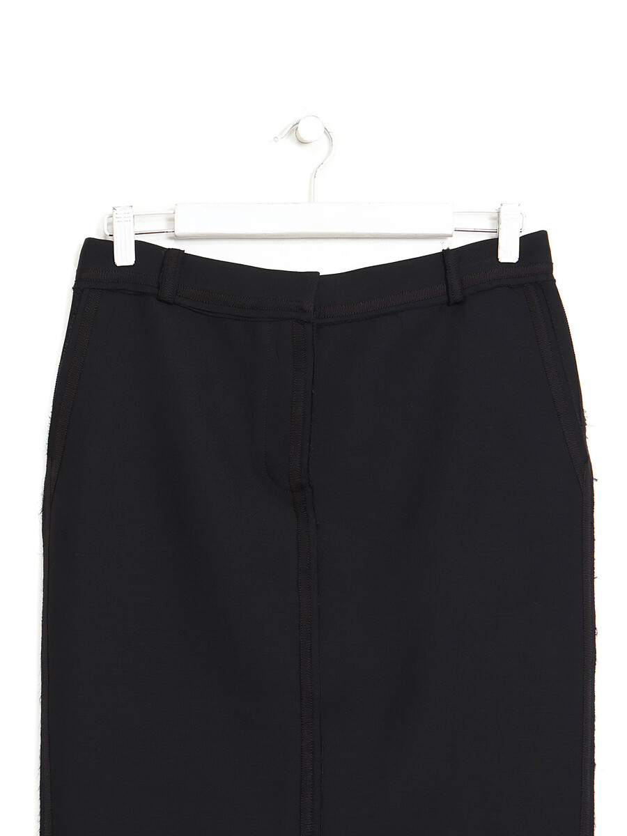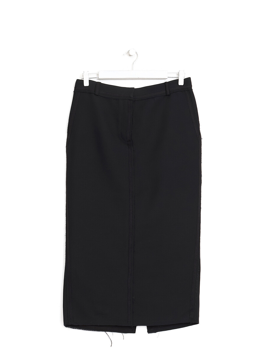 Midi skirt in black. Features a back slit for ease of movement. Side pockets. Concealed zip and hook closure.