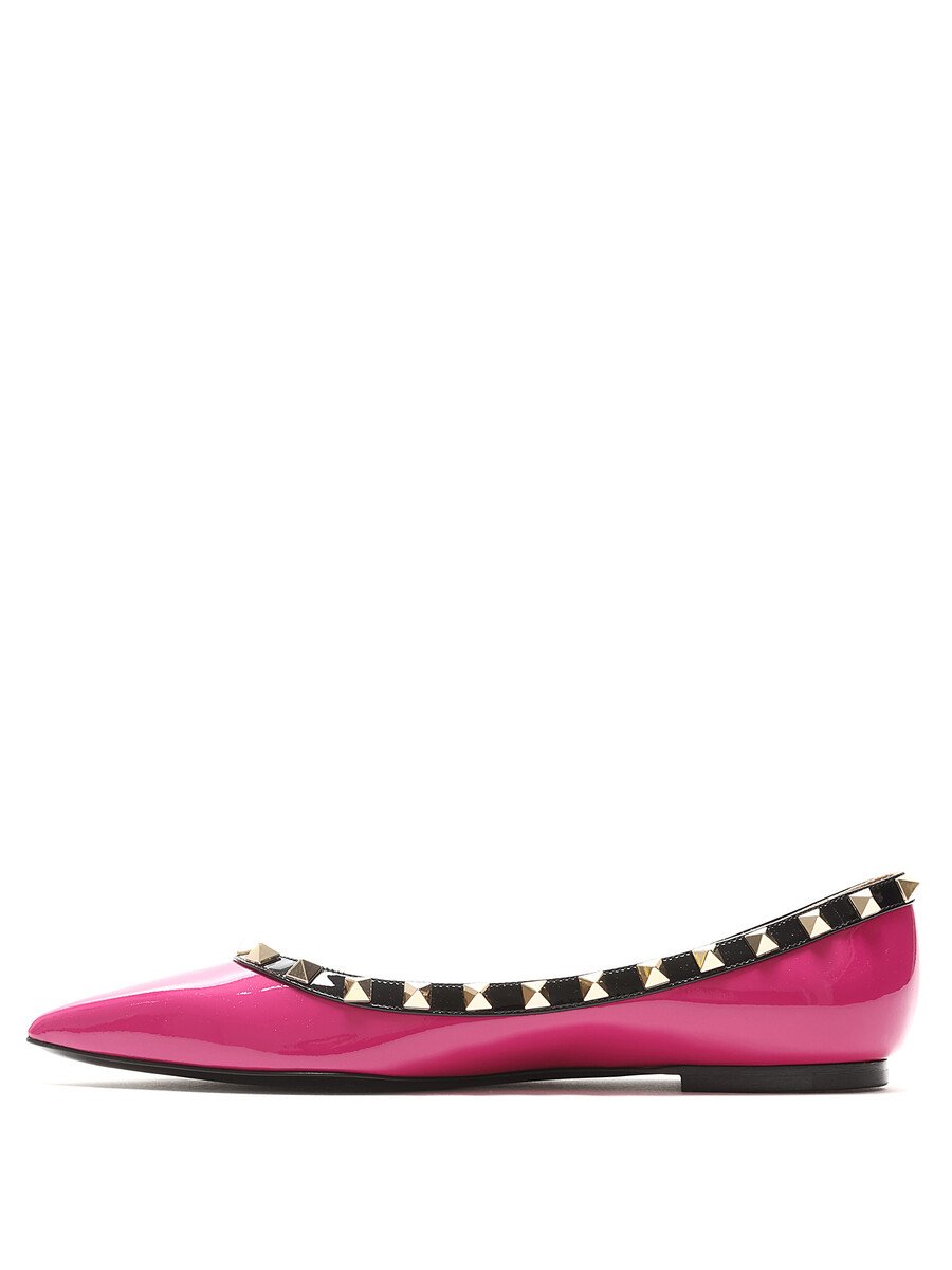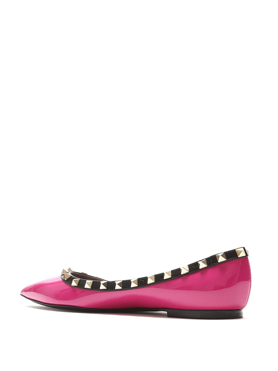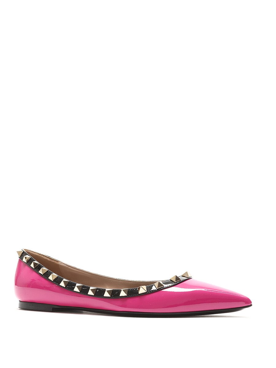 Patent leather ballet flats in pink with black accents. Slip-on style with pointed toe. Signature Rockstud detailing along the top edge. Leather sole.