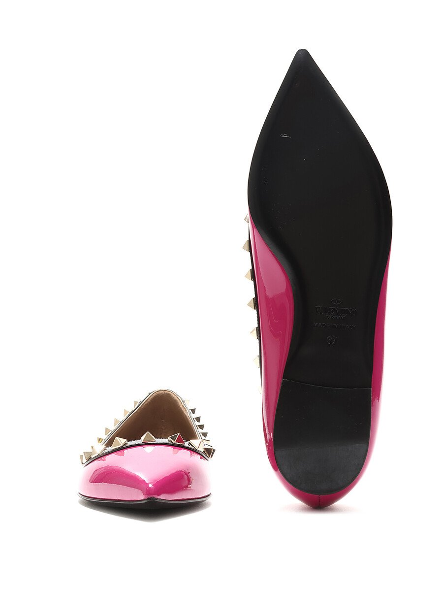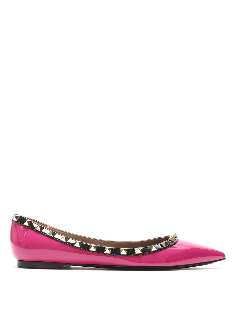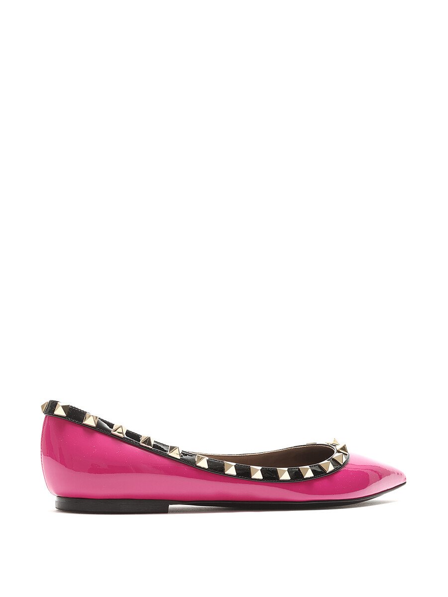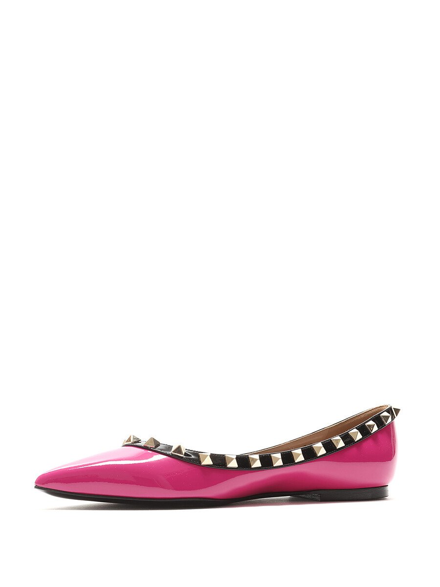 Patent leather ballet flats in pink with black accents. Slip-on style with pointed toe. Signature Rockstud detailing along the top edge. Leather sole.