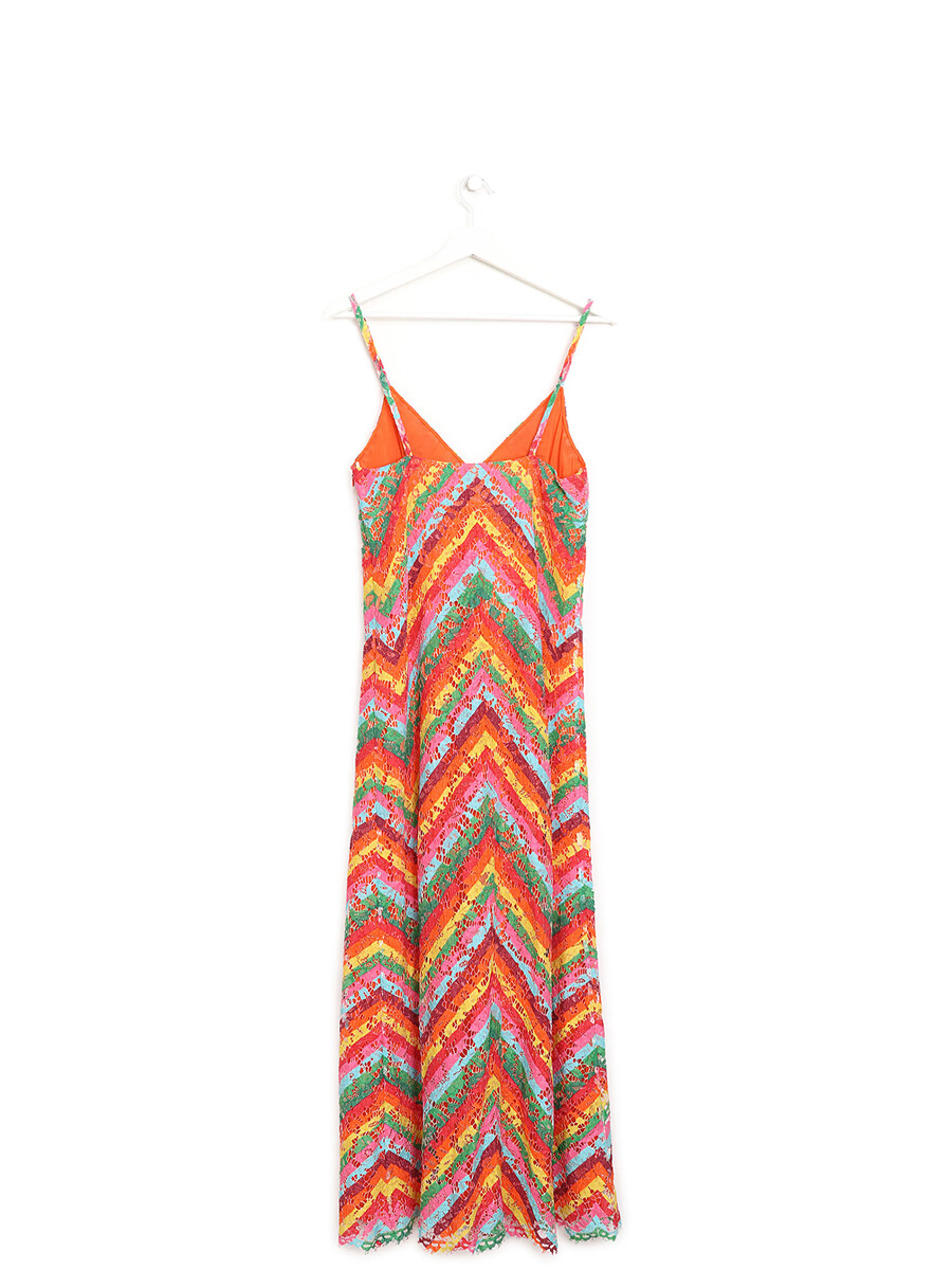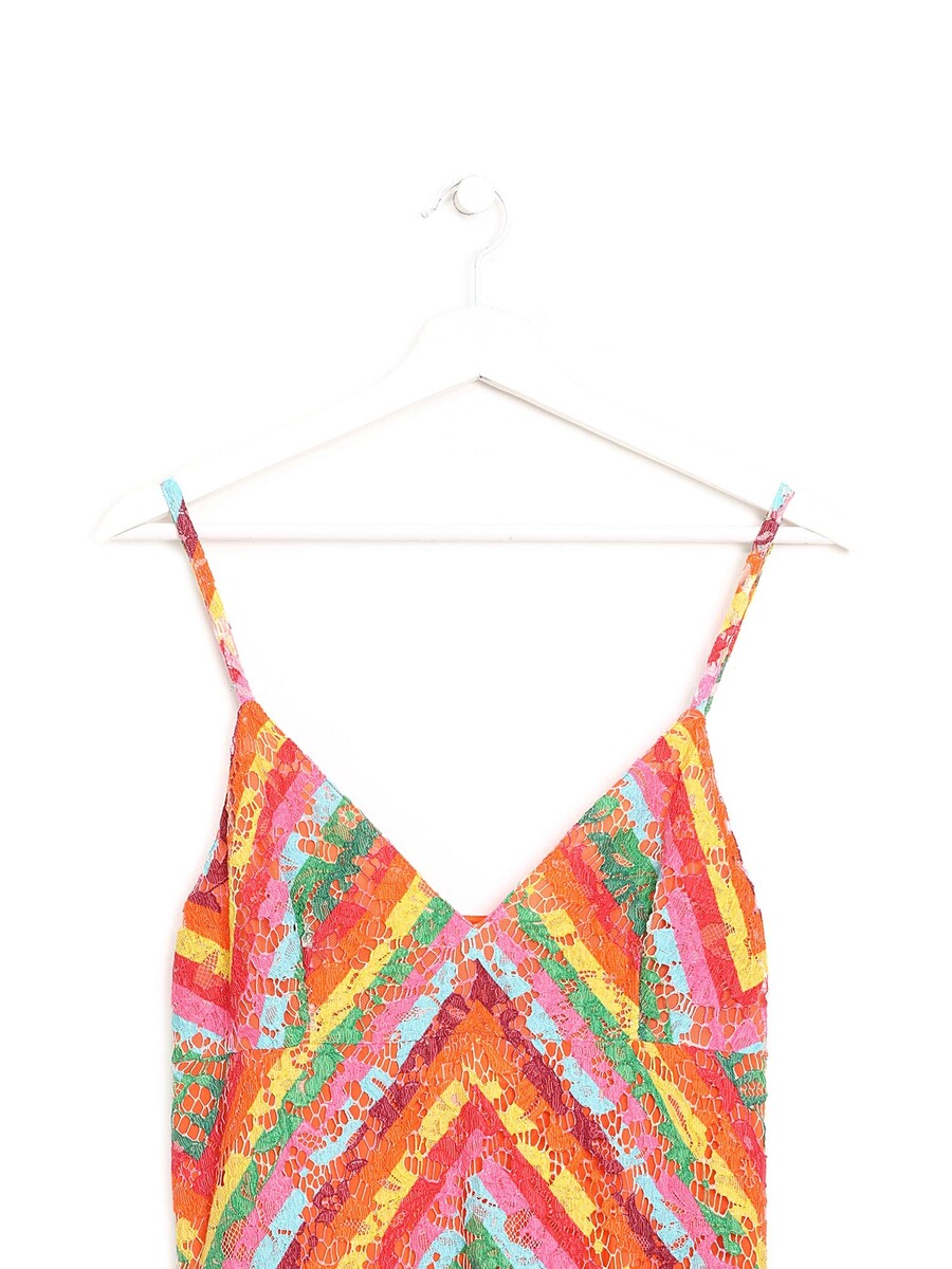 Sleeveless midi dress in multicolored chevron lace. V-neckline. Crafted with a blend of viscose, cotton, and polyamide.