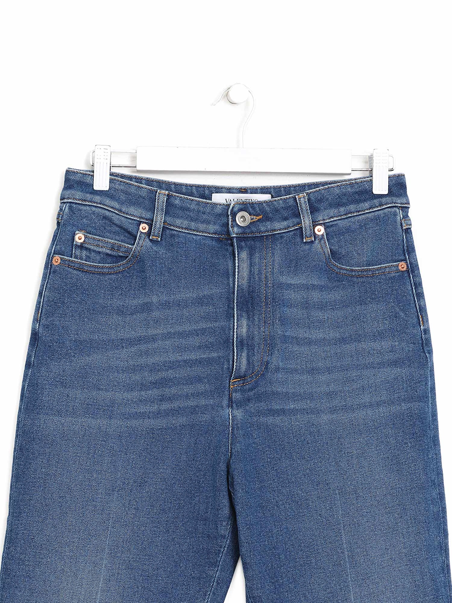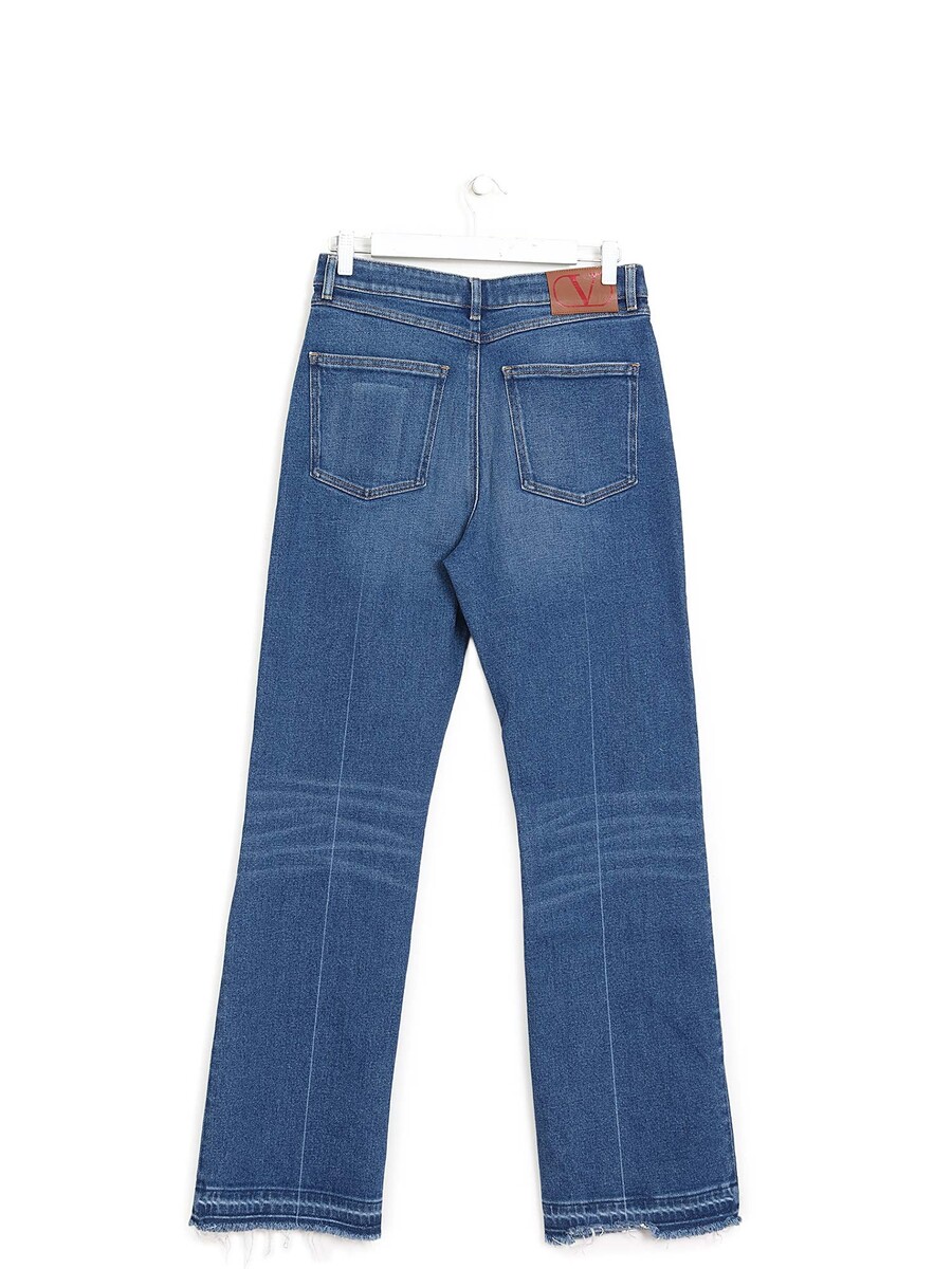 Fitted blue denim jeans with a medium-rise waist. Button fly closure. Classic five-pocket styling. Slightly stretchy feel.