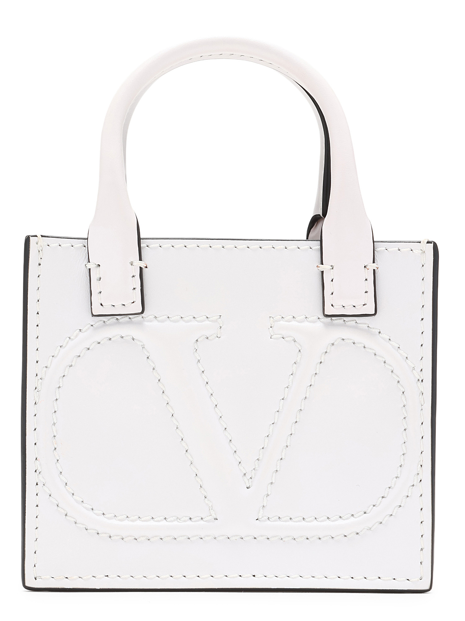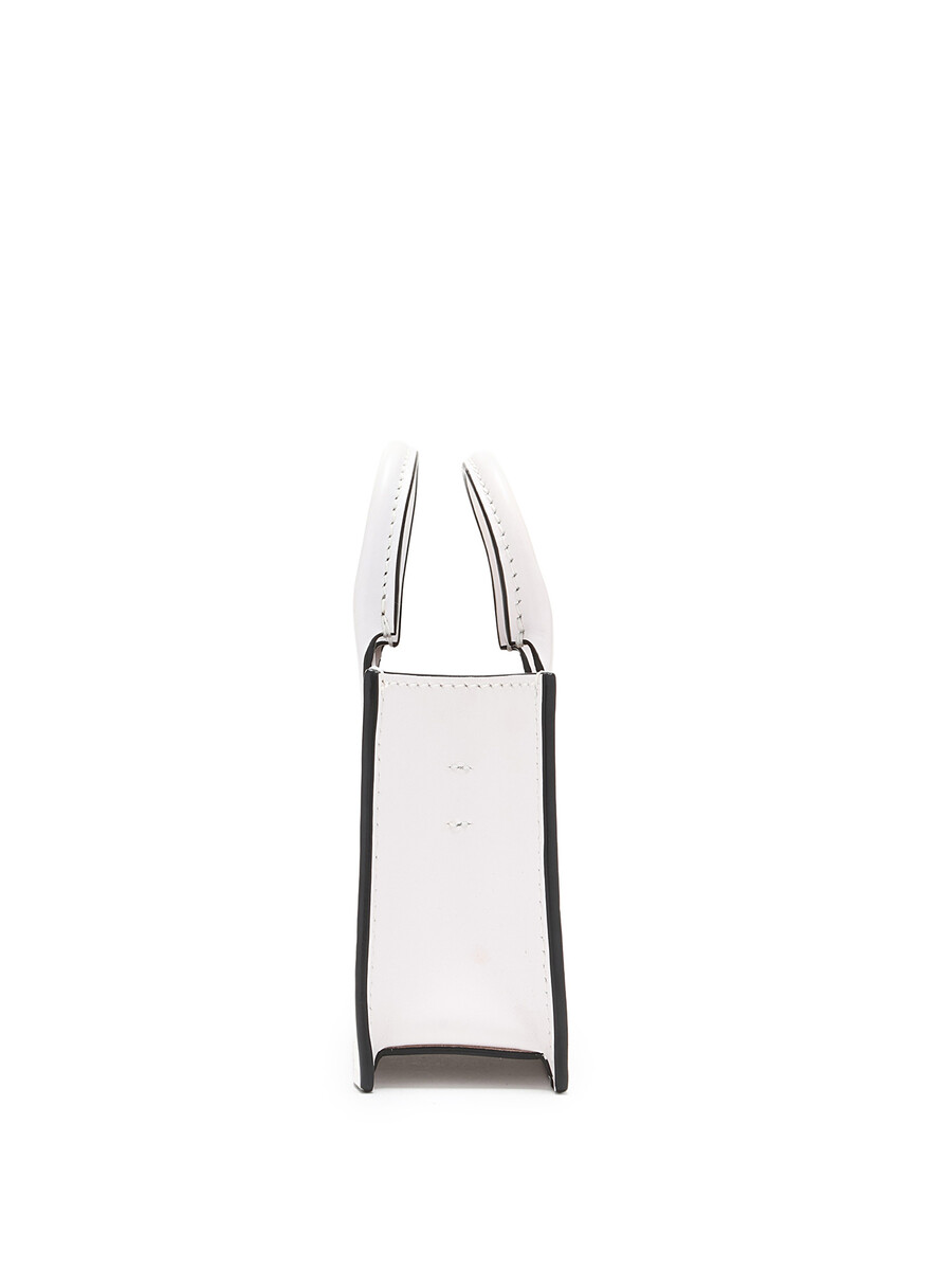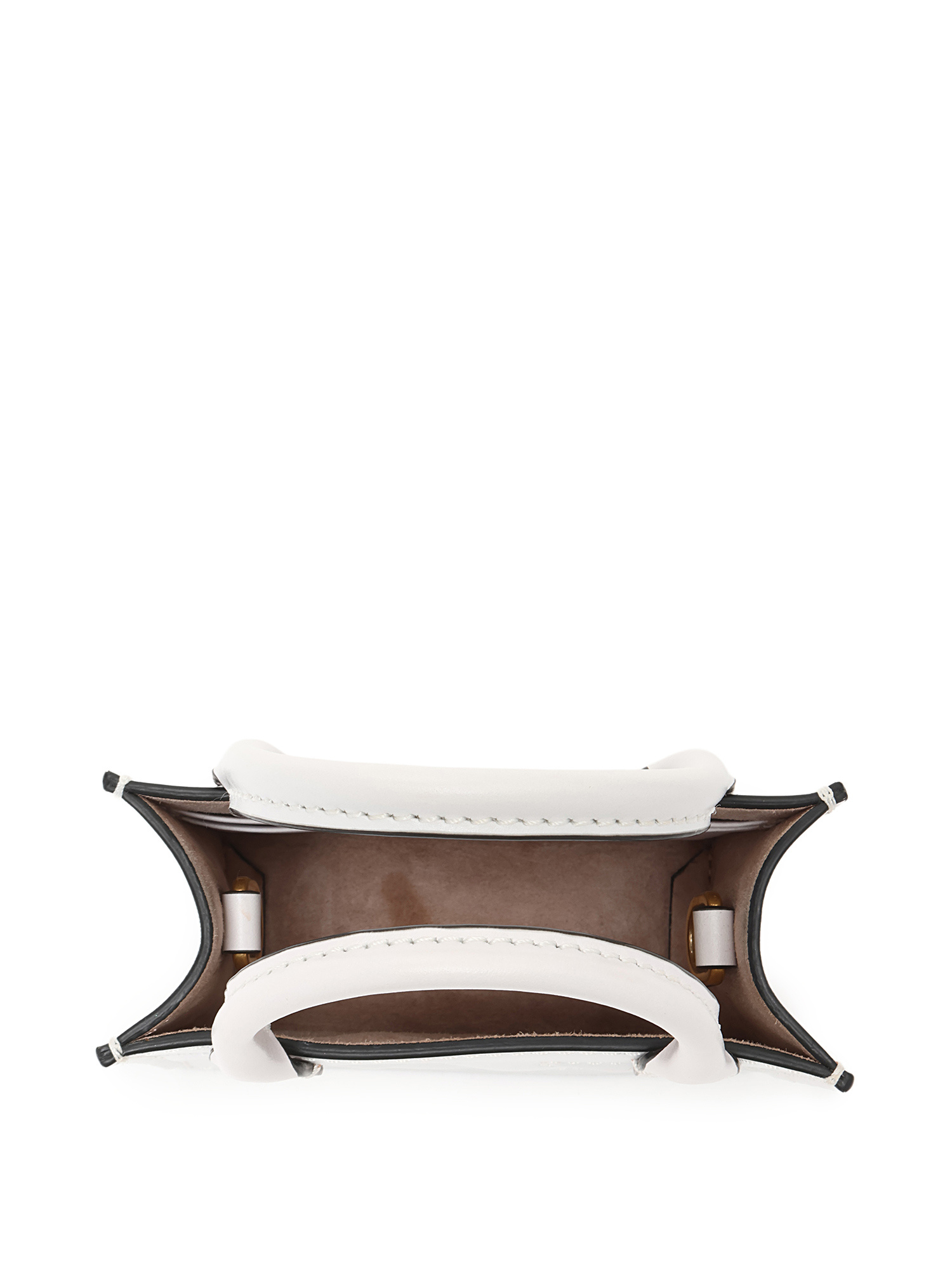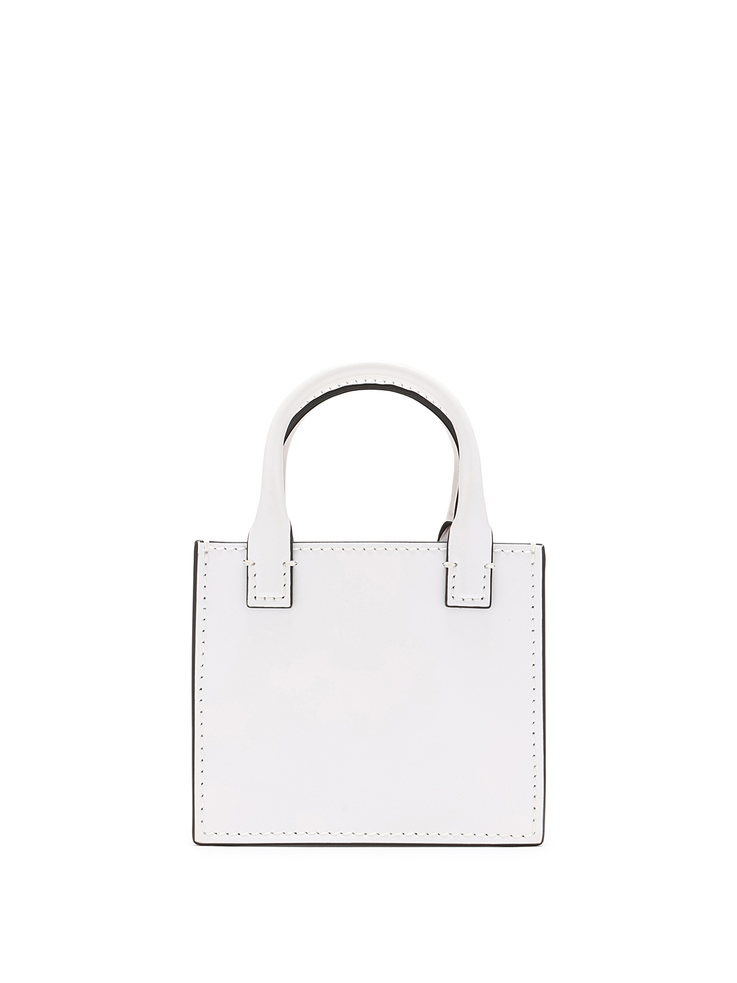 Mini tote bag in grained white leather with embossed logo. Top opening with clasp. Top handle and adjustable shoulder strap. Gold-tone hardware.