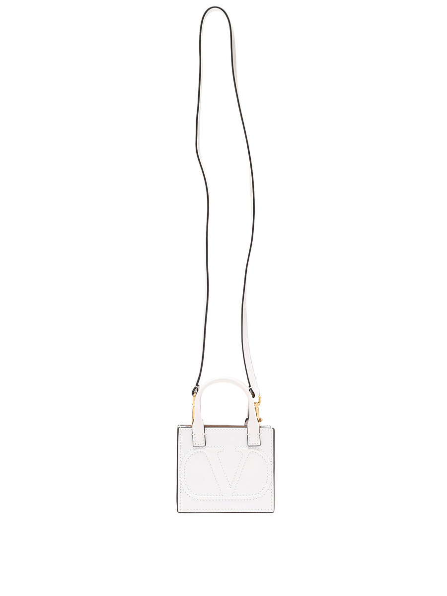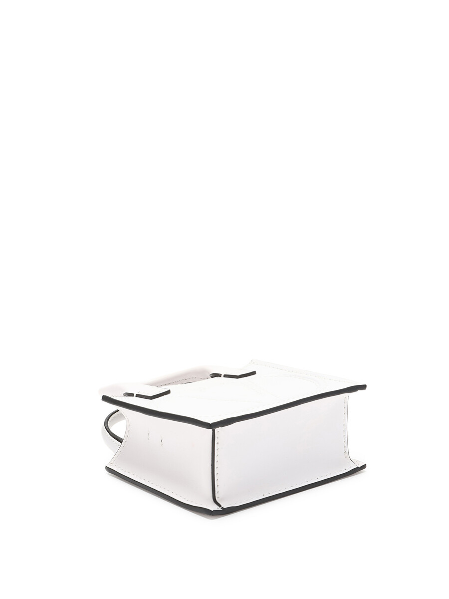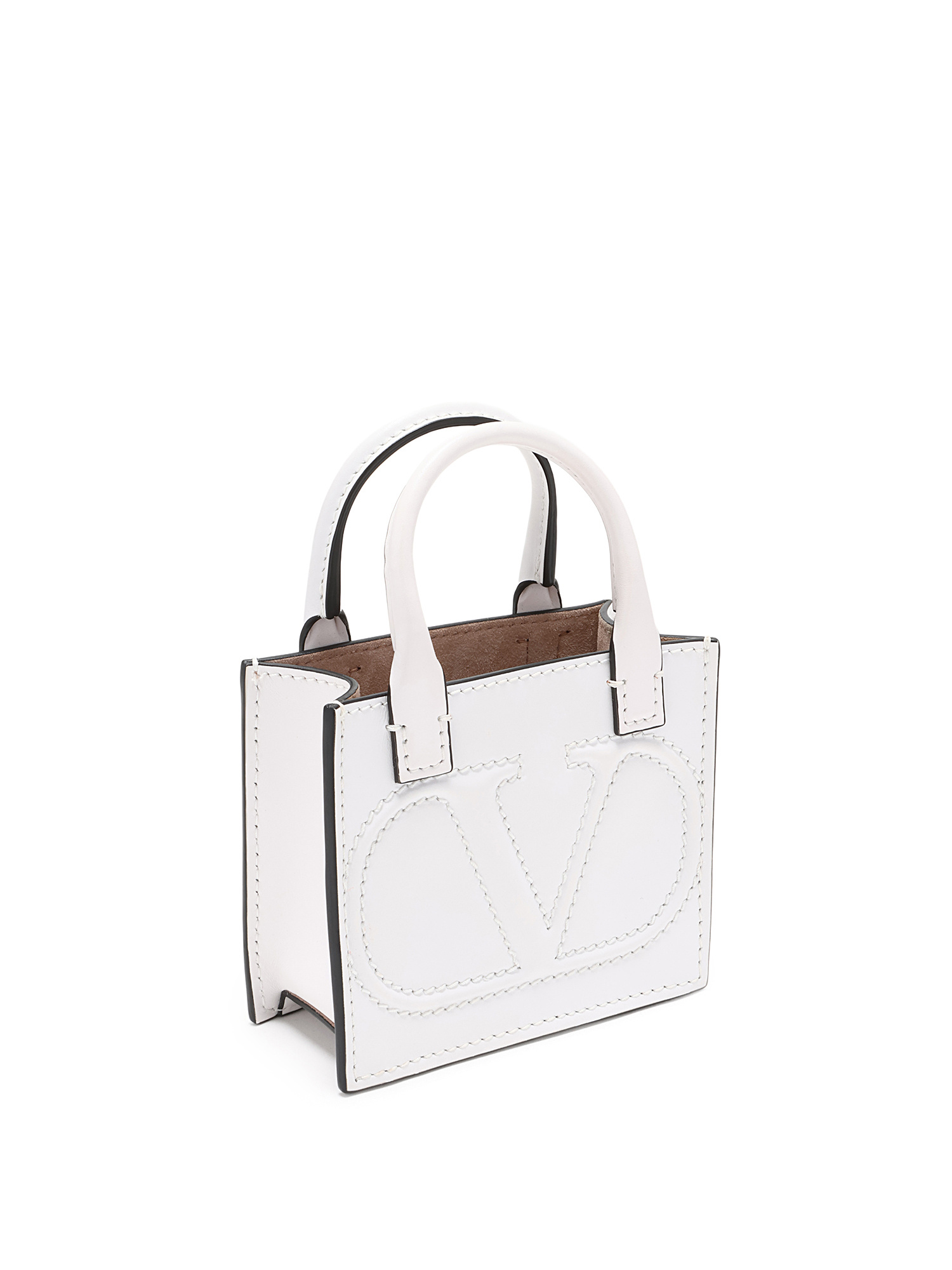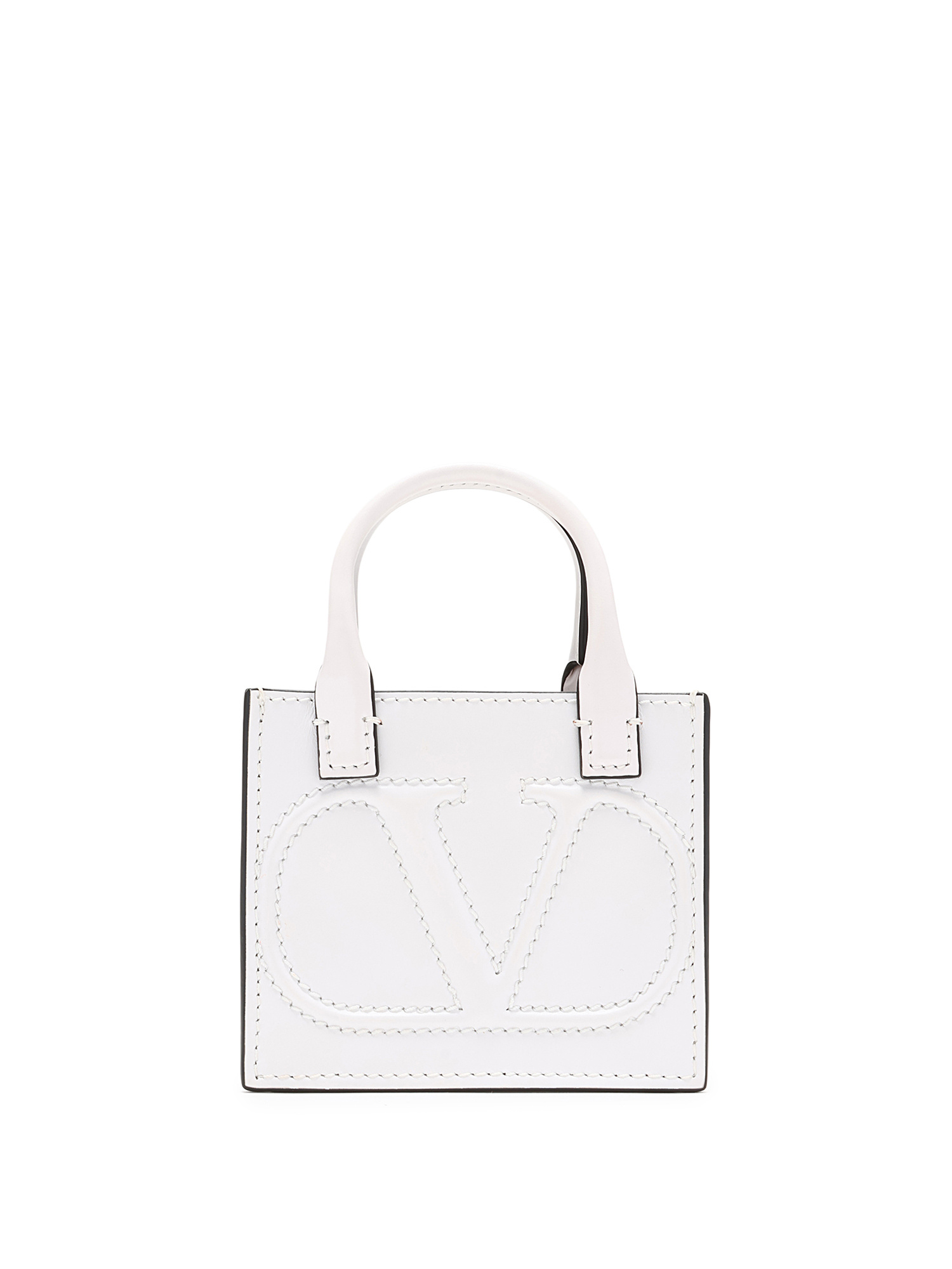 Mini tote bag in grained white leather with embossed logo. Top opening with clasp. Top handle and adjustable shoulder strap. Gold-tone hardware.