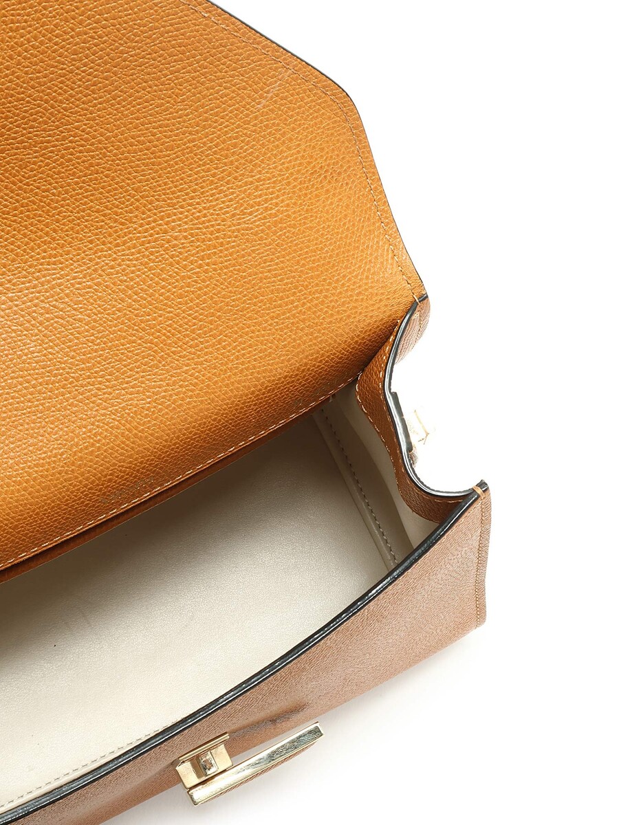 Grained leather handbag with top handle in brown. Flap with tab closure. Adjustable and detachable shoulder strap. Gold-tone hardware. Leather trims. With dust bag.
