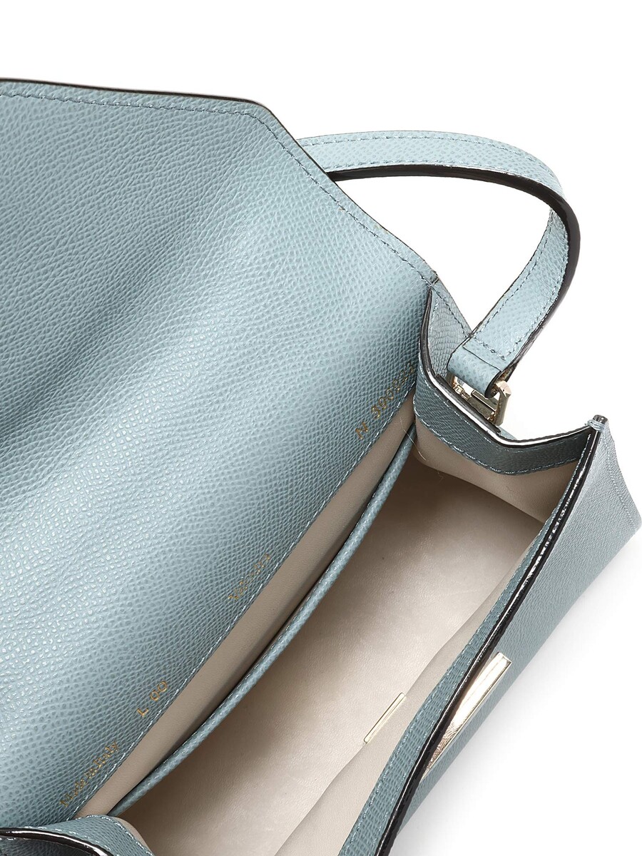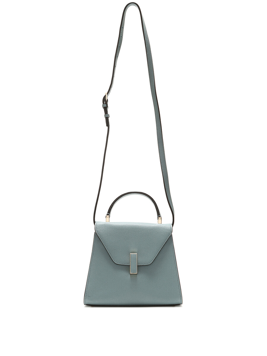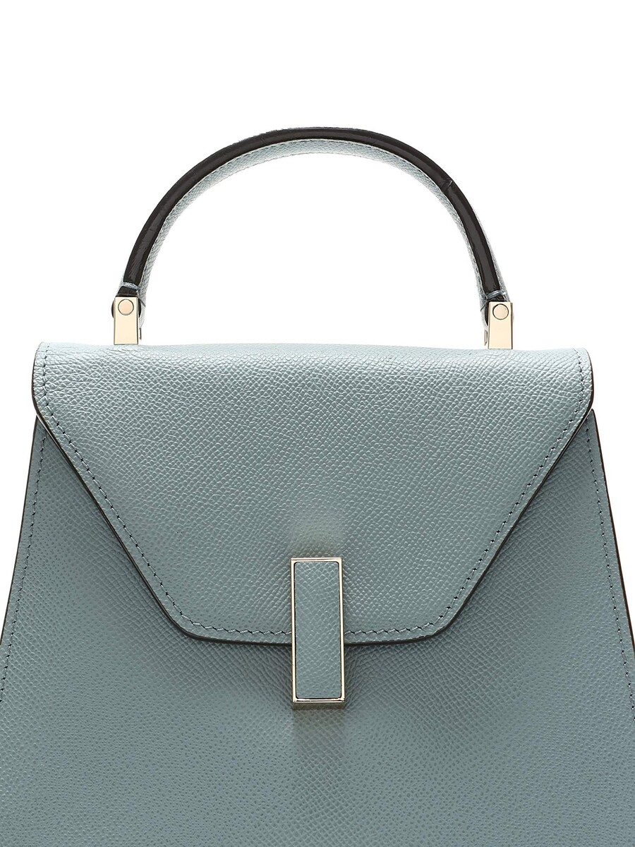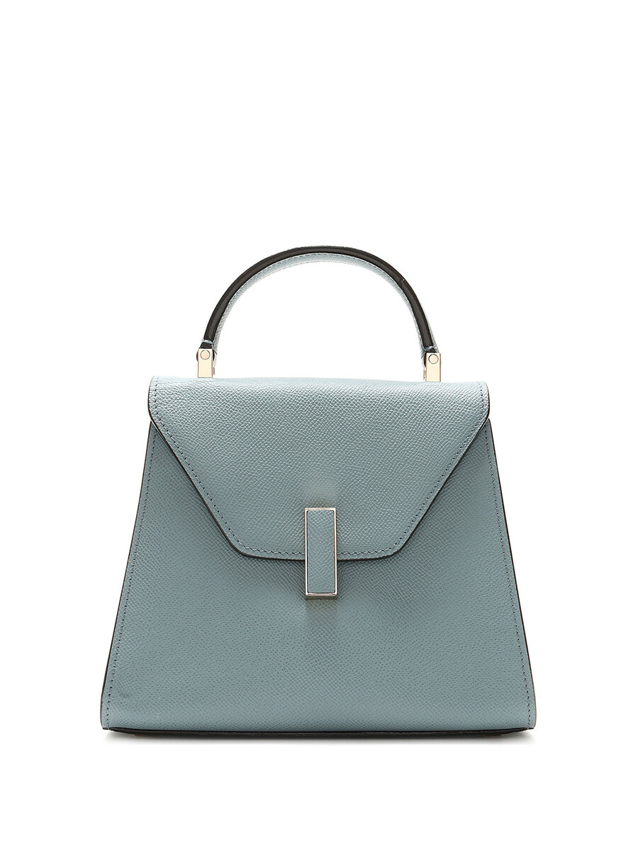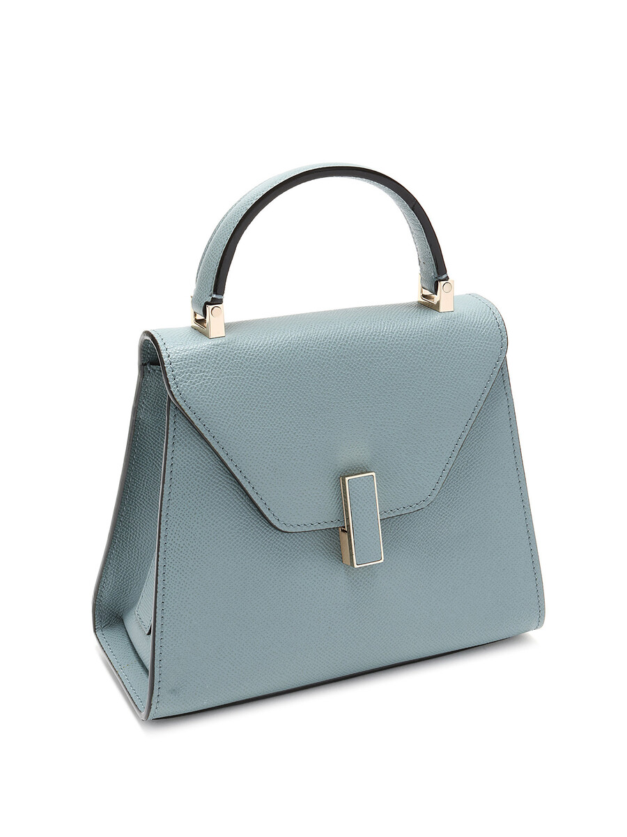 Iside top handle bag in dusty blue with pebbled leather texture. Features a tab with magnetic clasp, single top handle, and silver-tone hardware.
