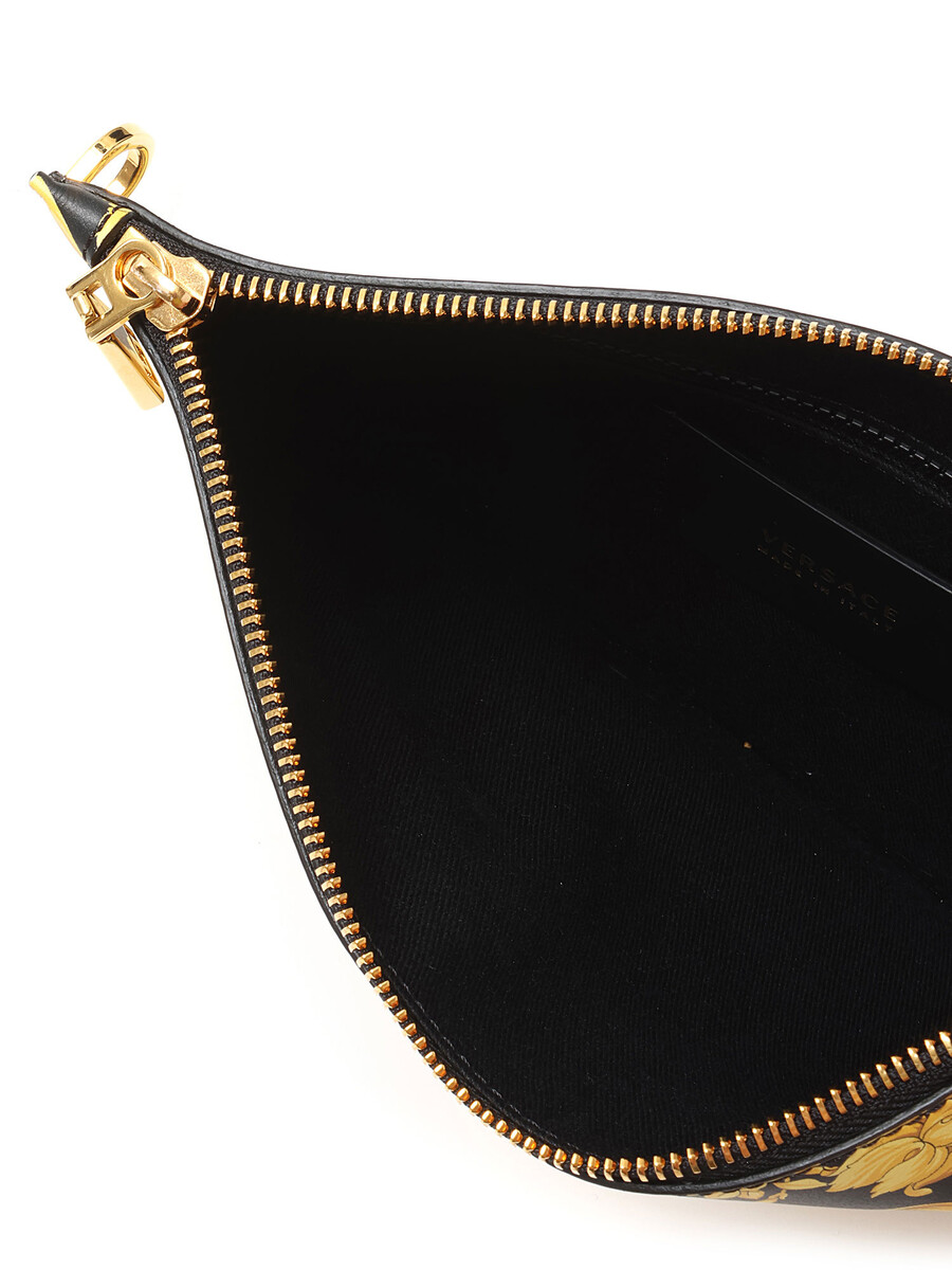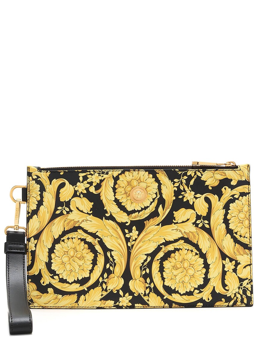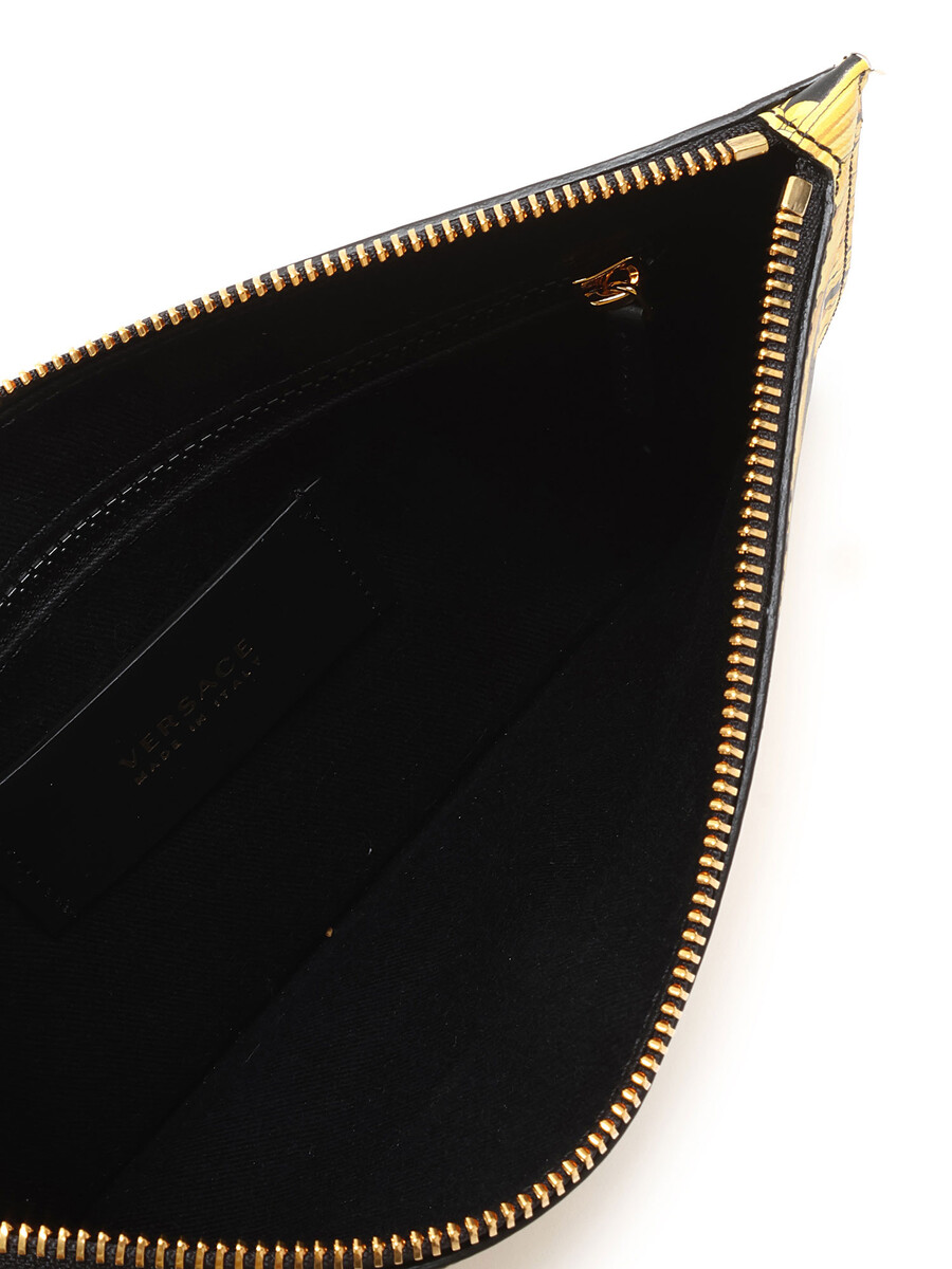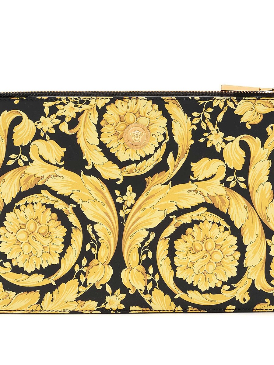 Baroque floral pattern leather clutch in black and yellow. Zip closure. Detachable leather wrist strap. Gold-tone hardware.