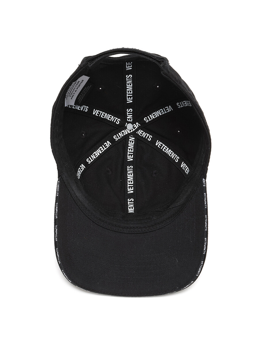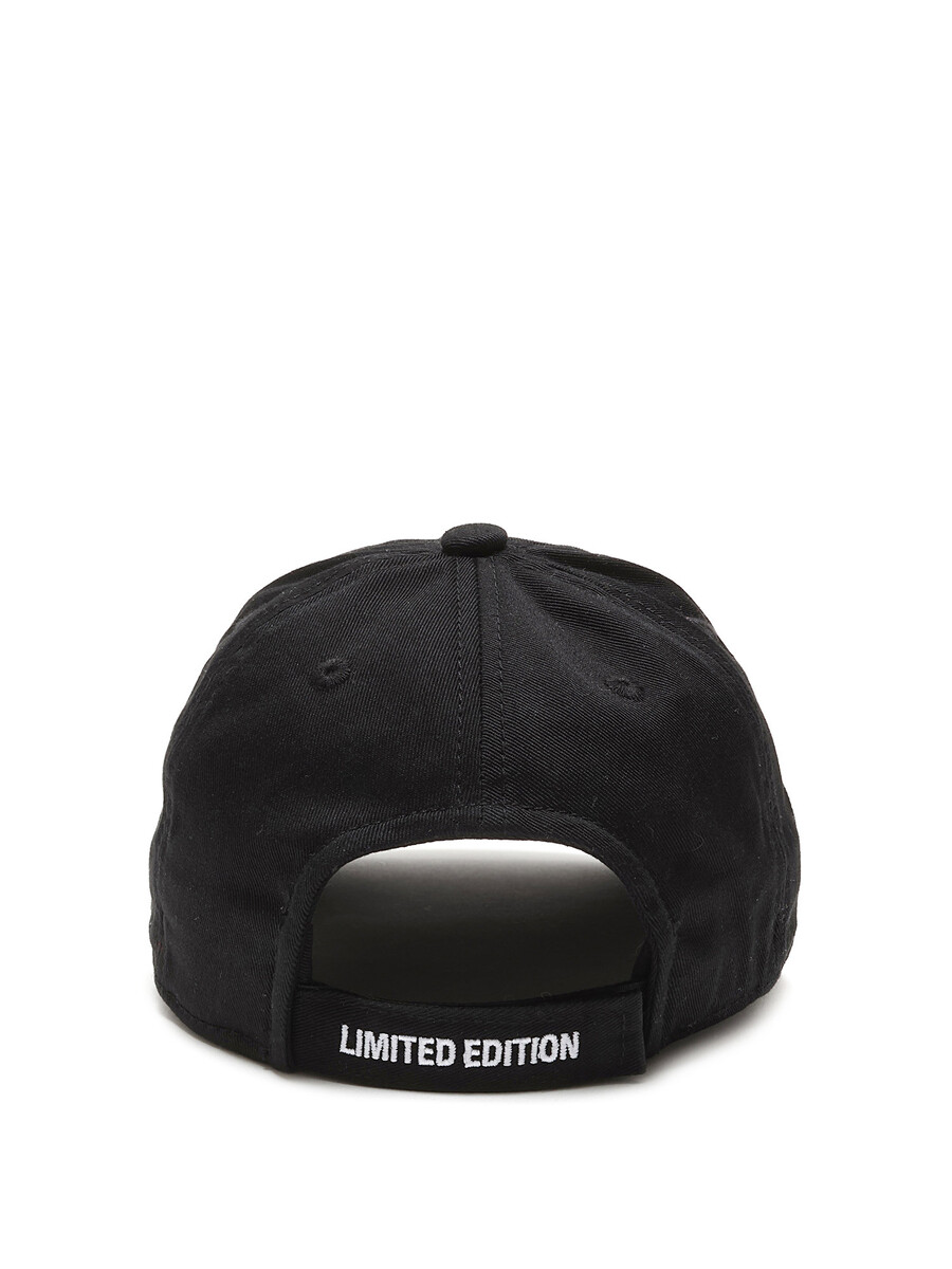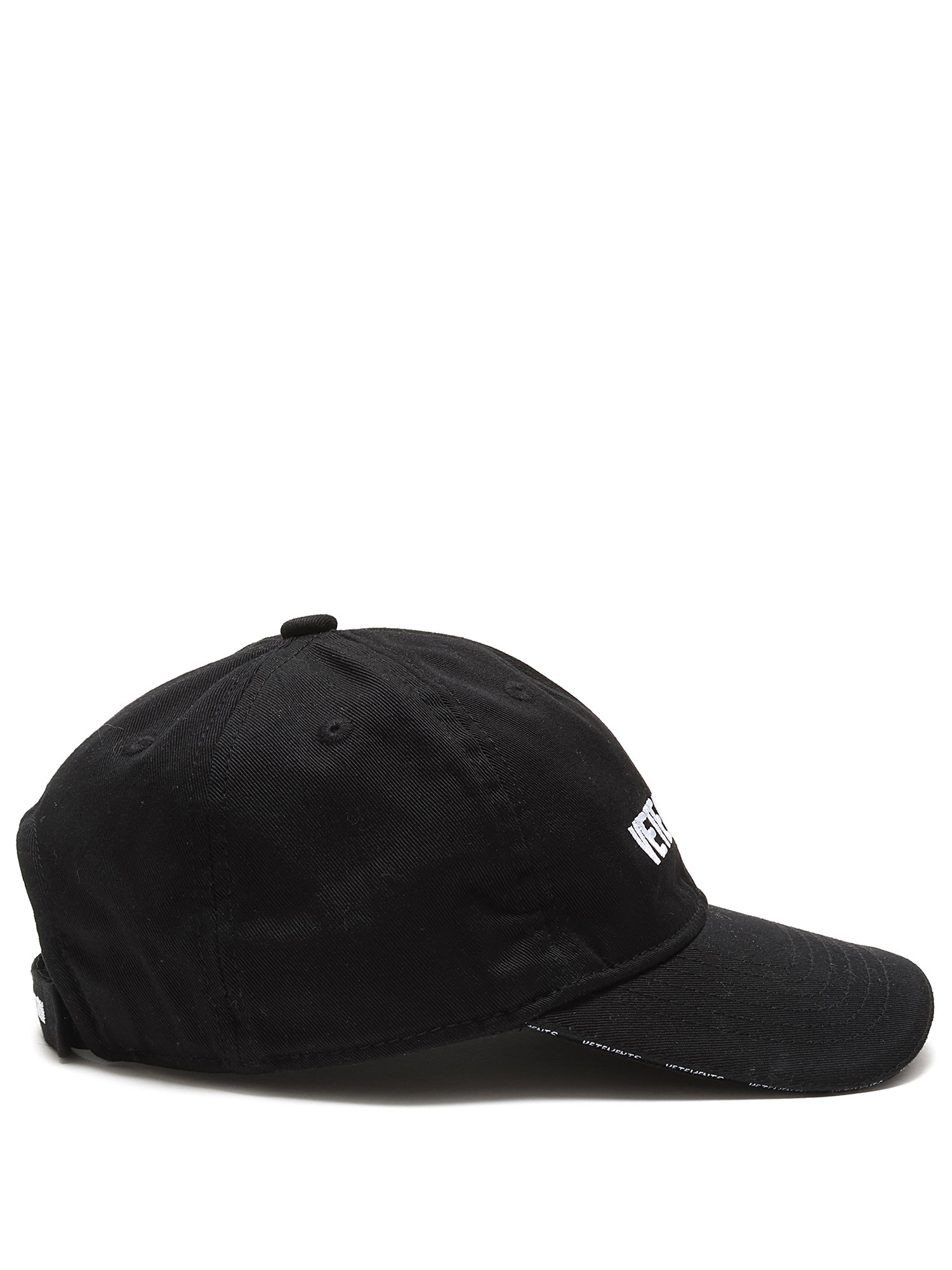 Black cotton cap featuring white embroidered logo. Adjustable strap closure for customized fit.