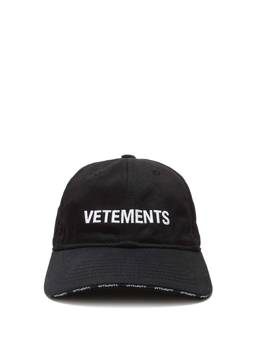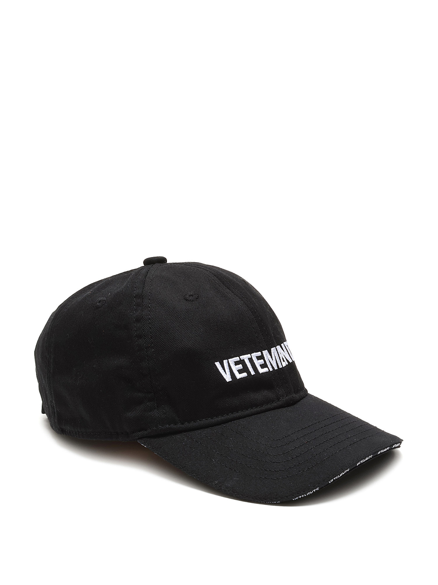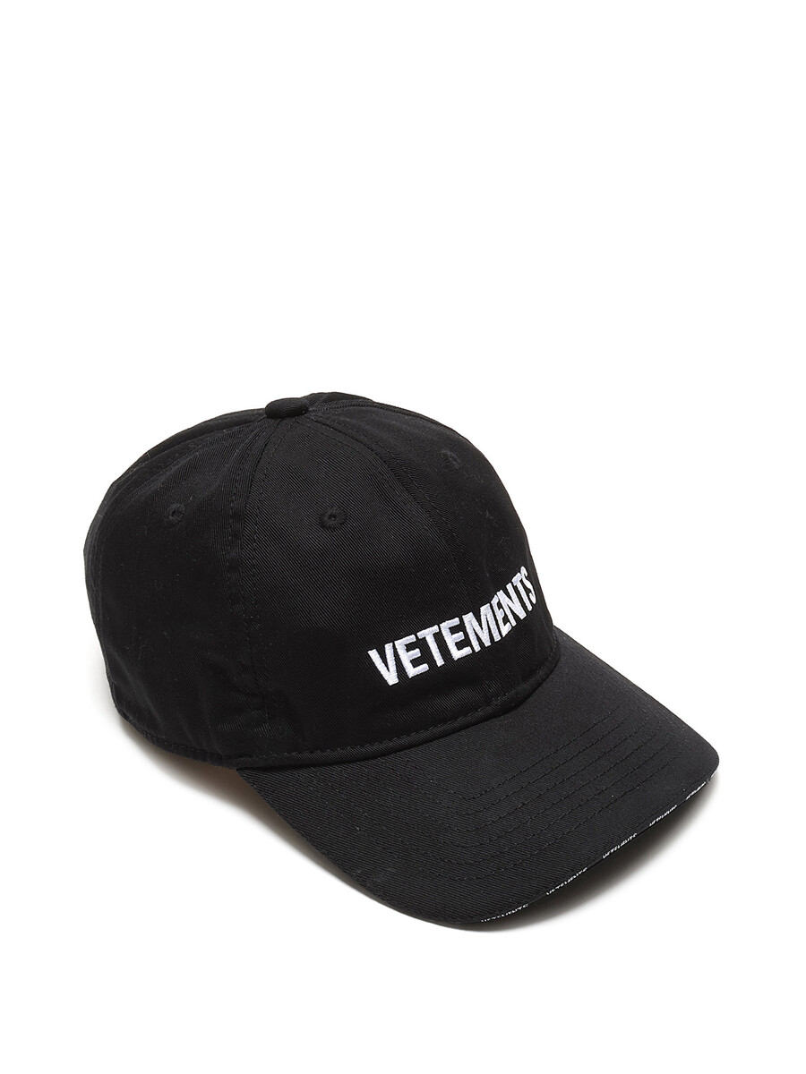 Black cotton cap featuring white embroidered logo. Adjustable strap closure for customized fit.