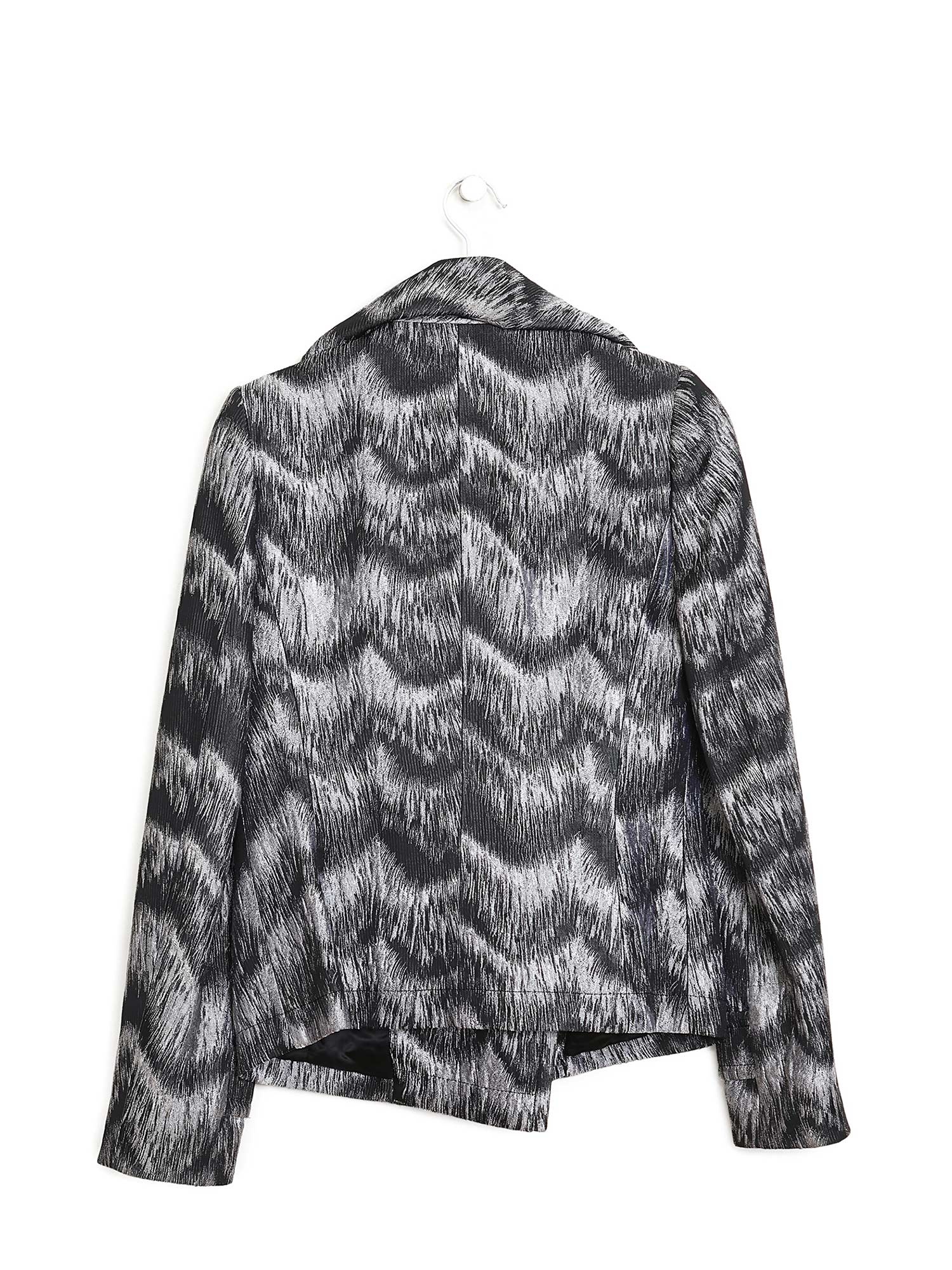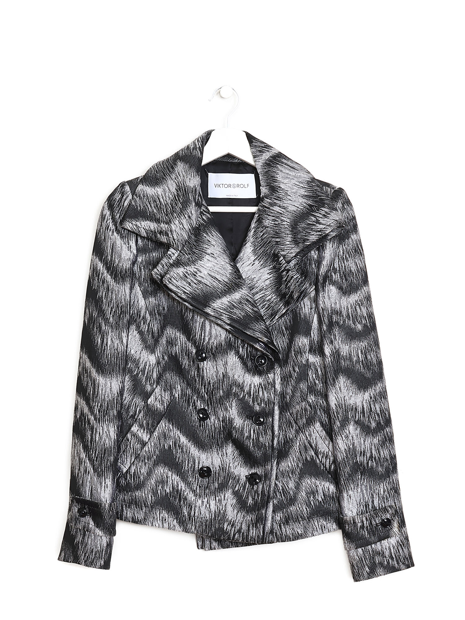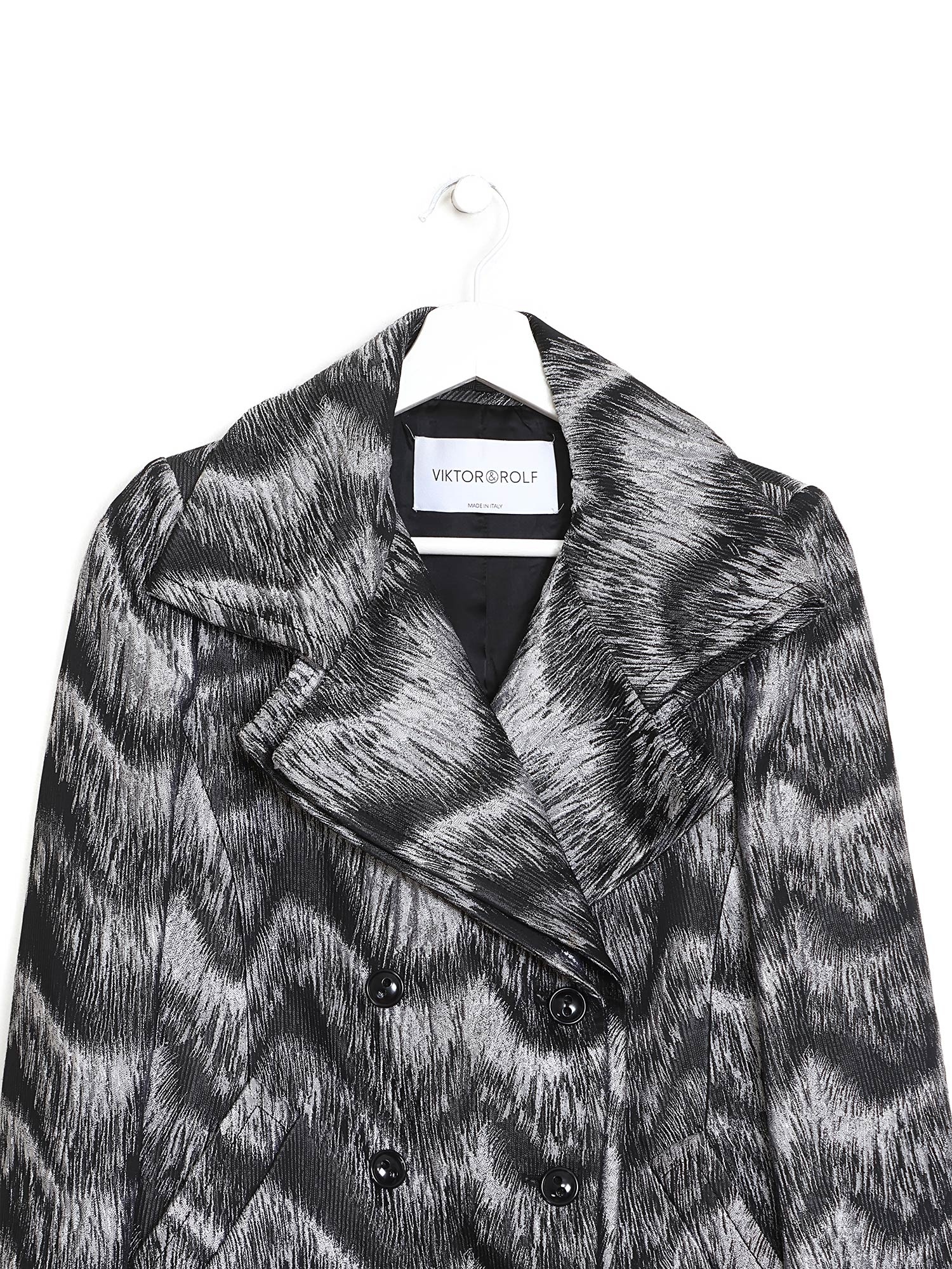 Double-breasted jacquard blazer in grey and black with a patterned design. Black button closure. Structured shoulders. Tailored fit.