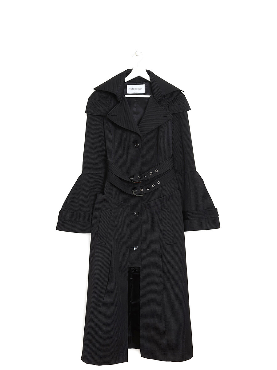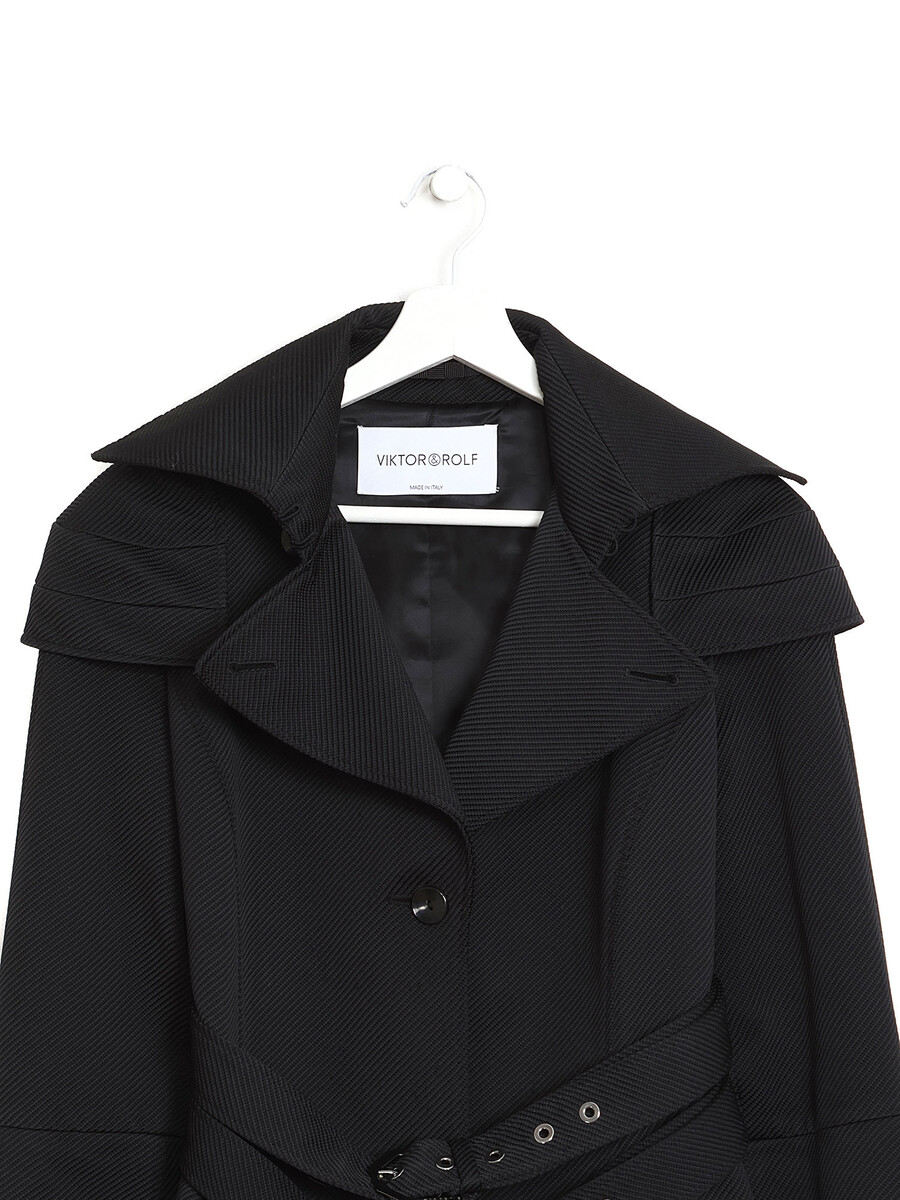 Convertible long coat in black. Notched lapel collar with button front closure. Front flap pockets. Two interior pockets.