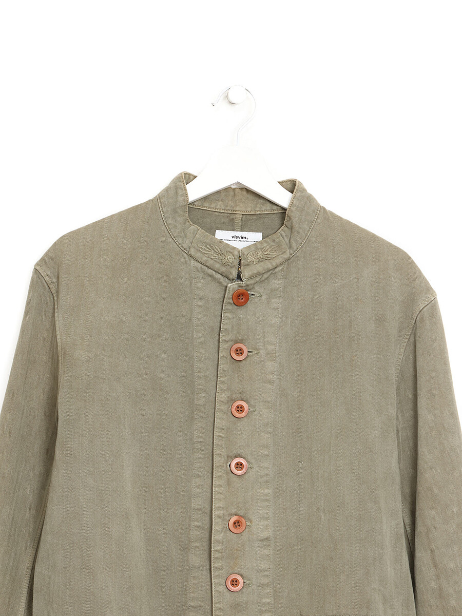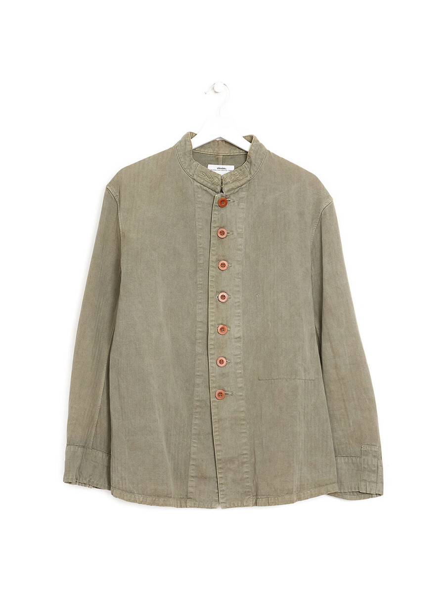 Cotton-linen blend button-up jacket in khaki. High collar. Button front with hook closure. Part of the SS14 collection.
