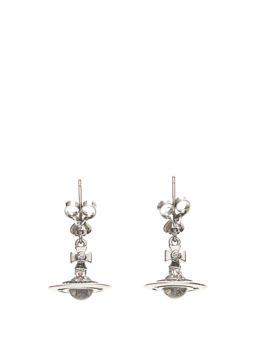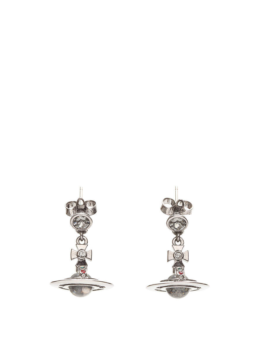 Orb drop earrings featuring crystal embellishments in silver metal, red, and blue. Stud closure. Signature Vivienne Westwood style.