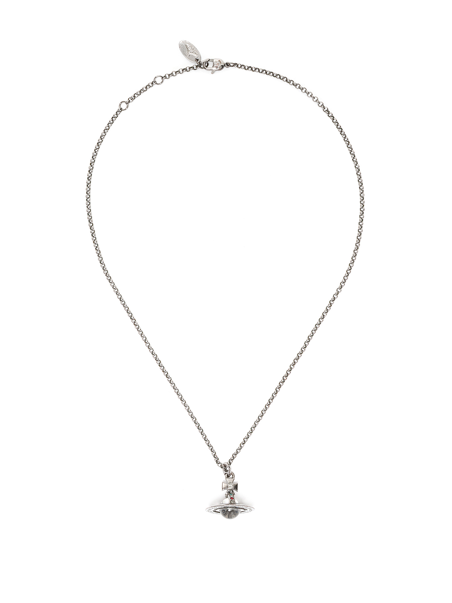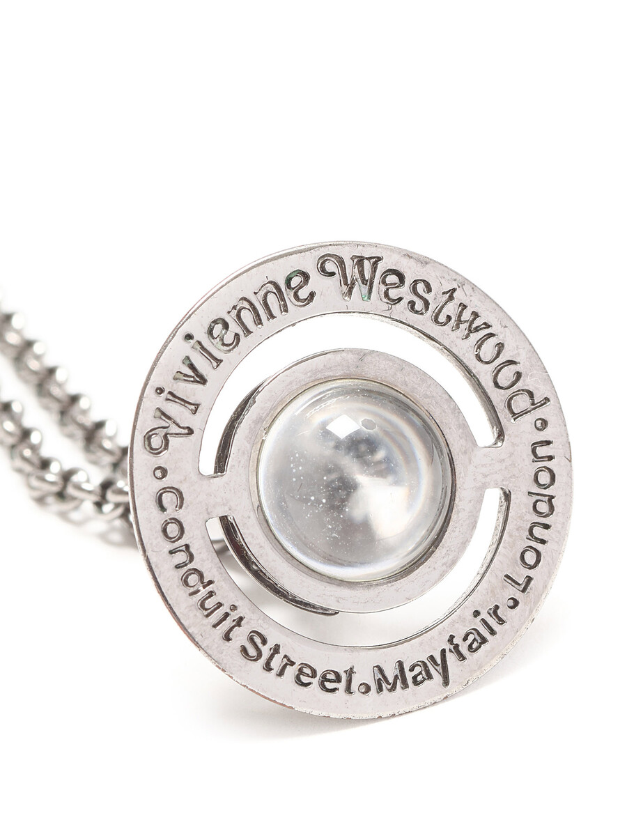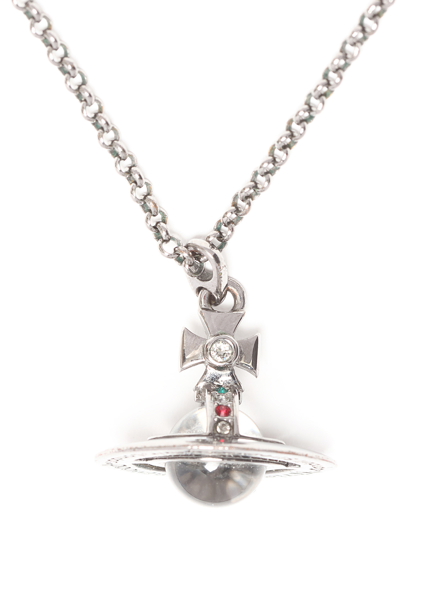 Silver-tone necklace featuring a round pendant with Vivienne Westwood's signature orb design embellished with red and blue rhinestones. Attached to a silver metal chain with a secure lobster clasp.