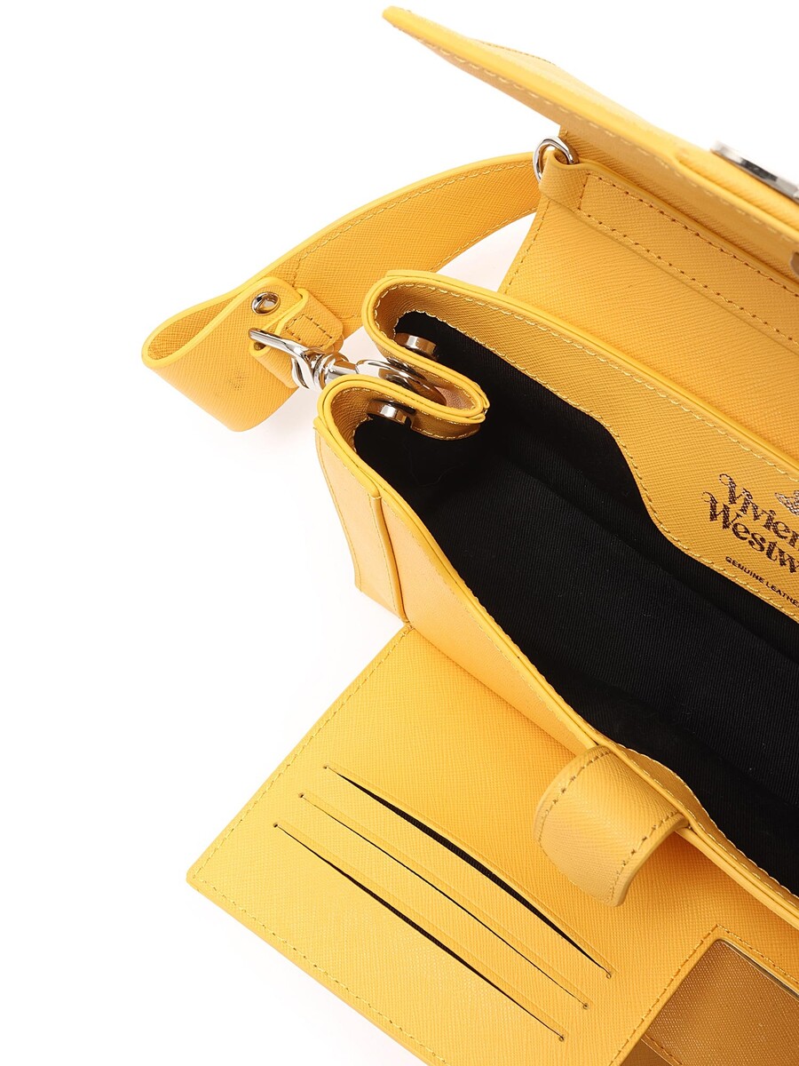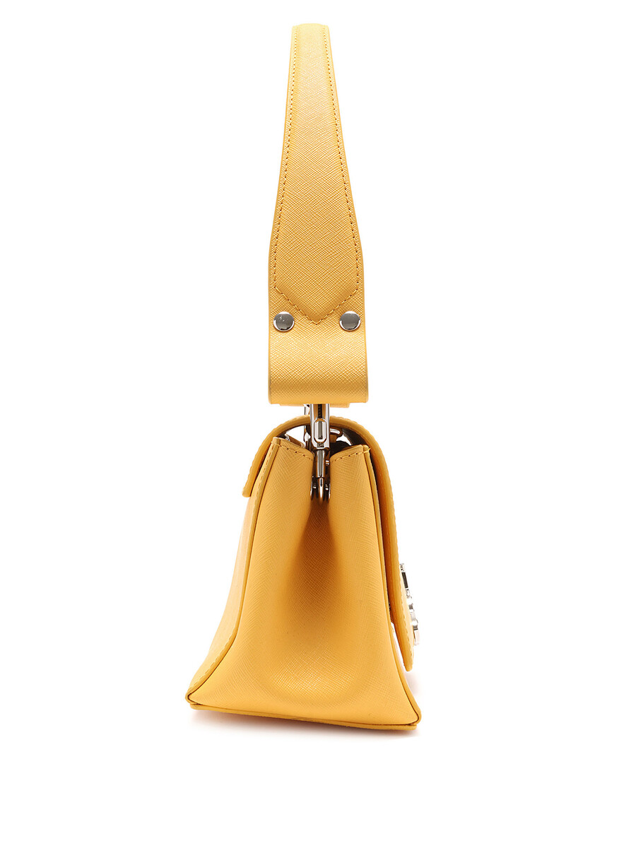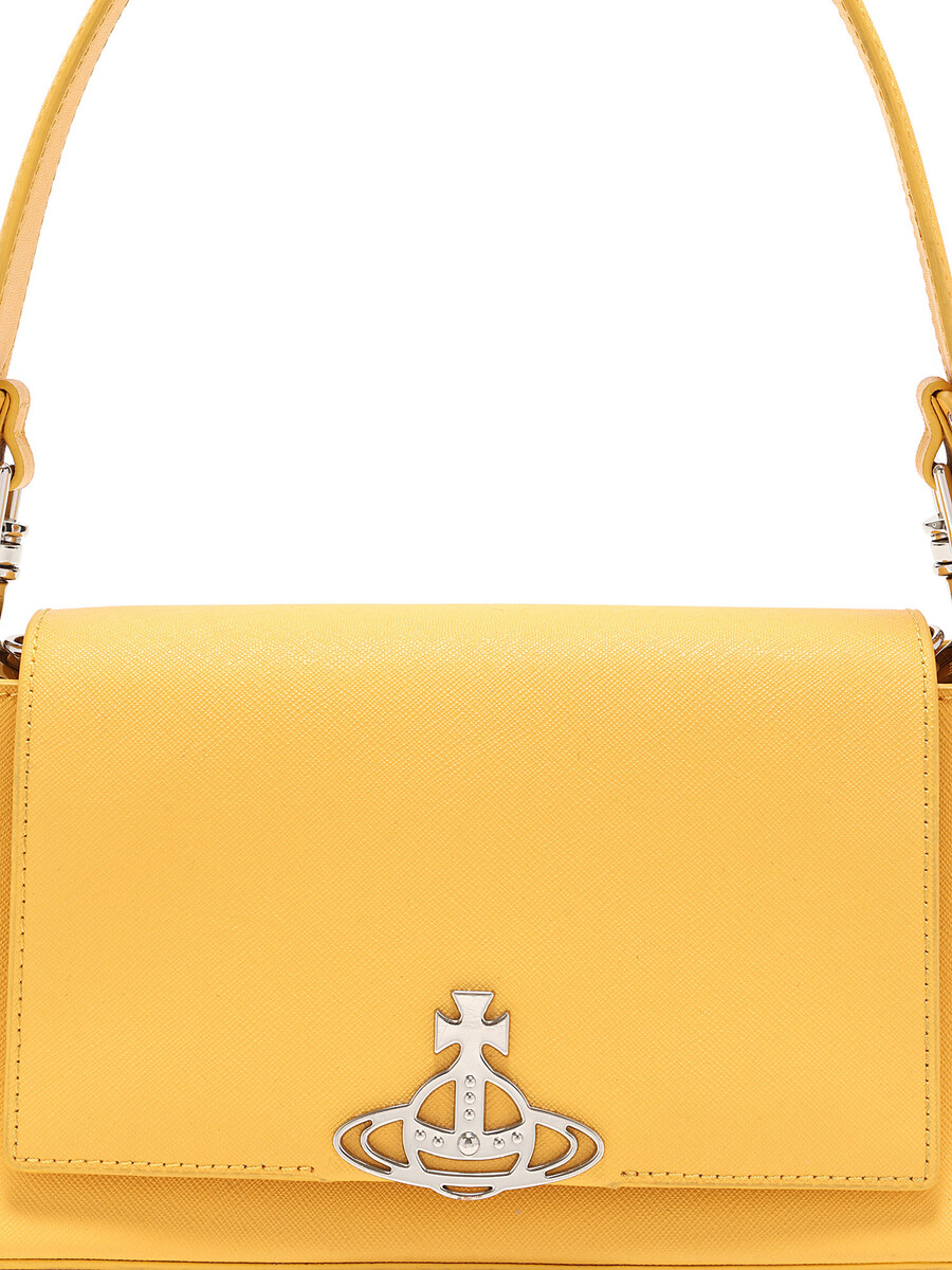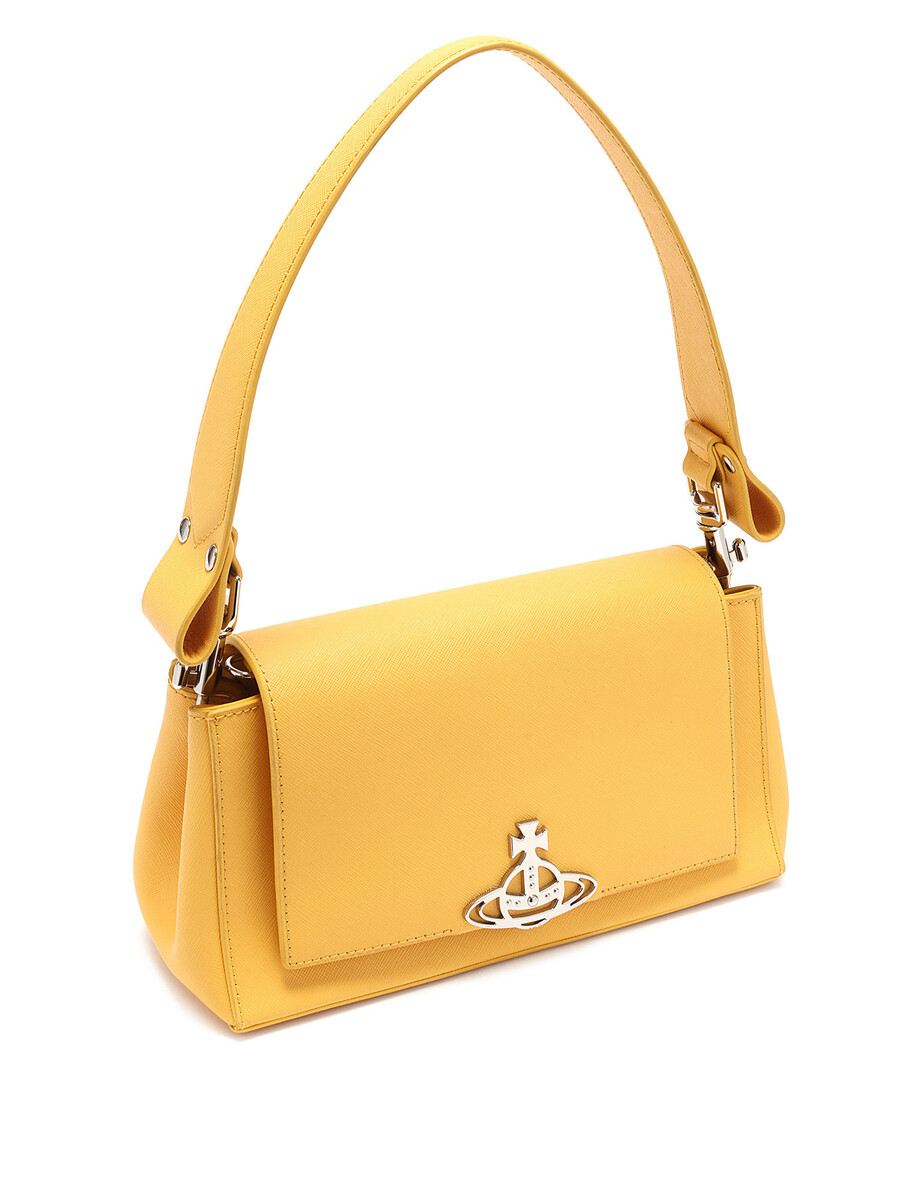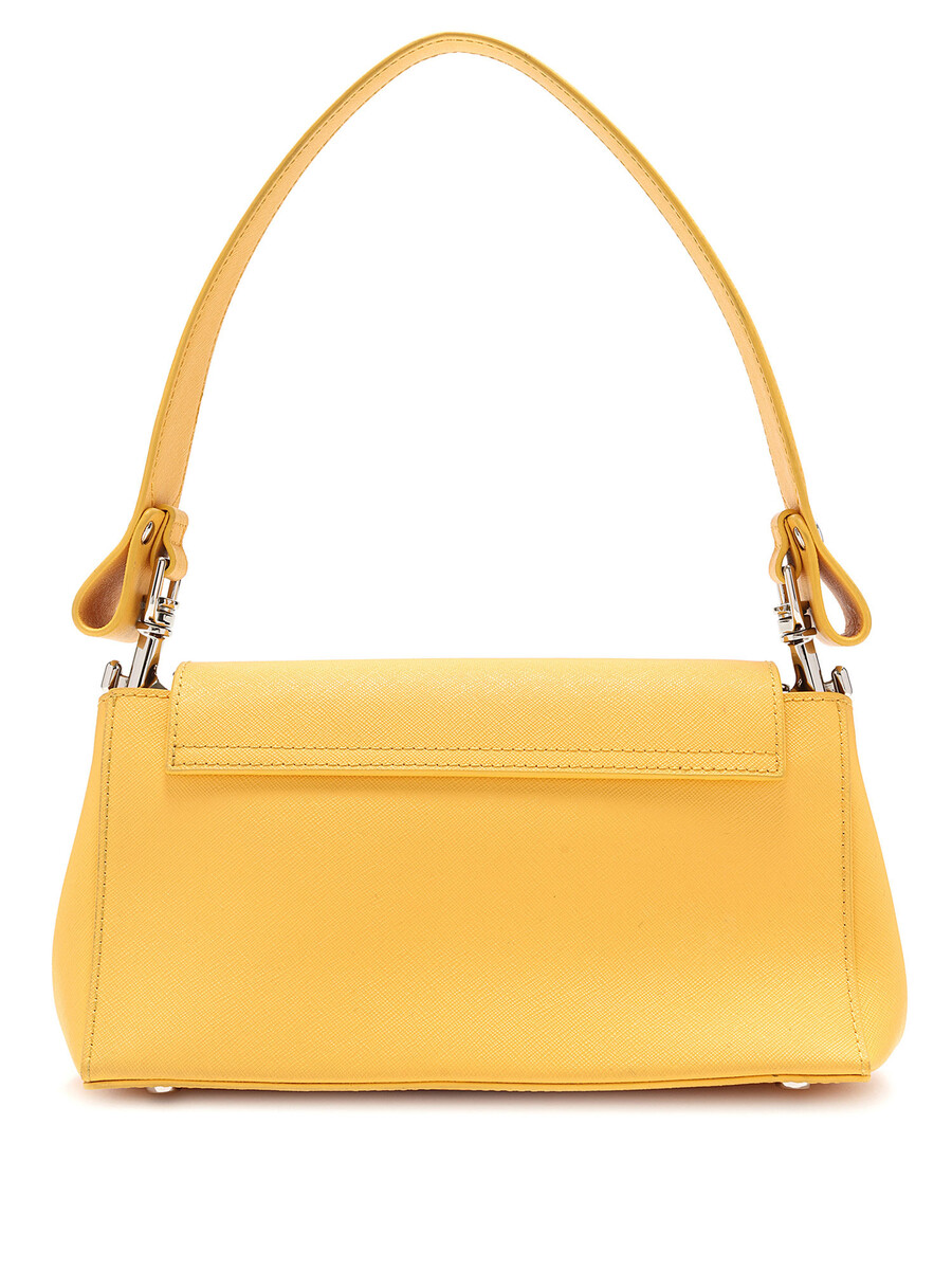 Shoulder bag in mustard yellow leather featuring a magnetic snap closure. Comes with a leather shoulder strap and detachable chain strap. Silver-tone hardware.