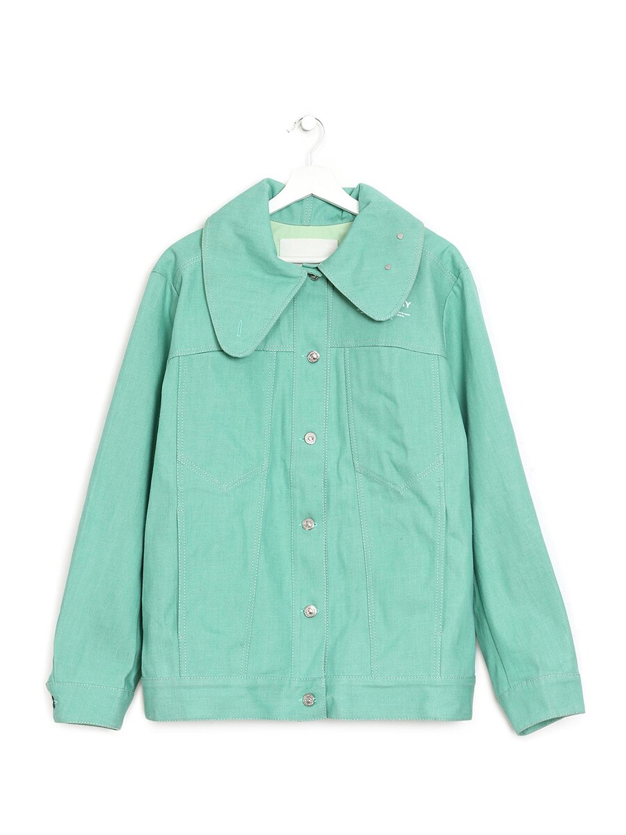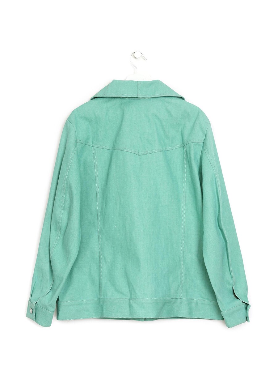 Mint green cotton jacket with large collar. Button closure. Flap pockets at front.