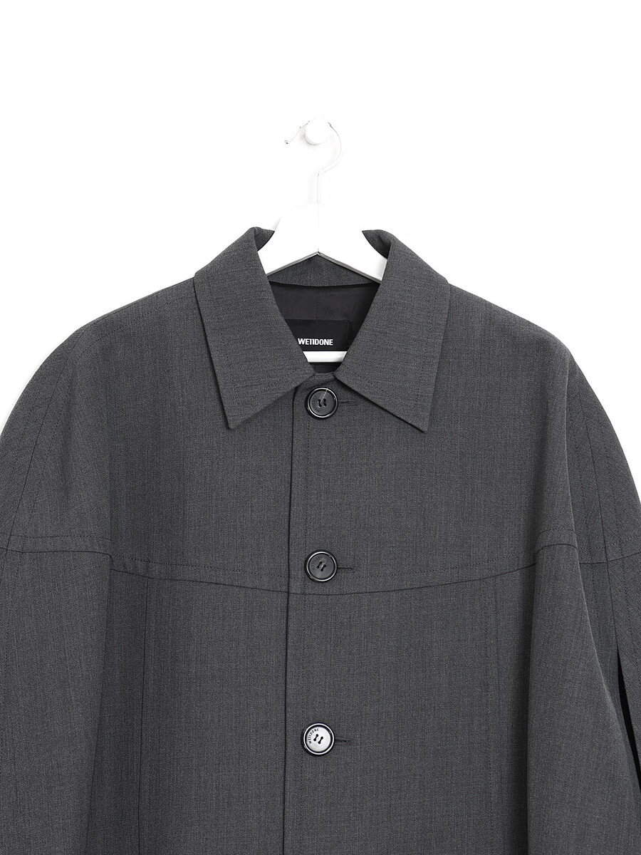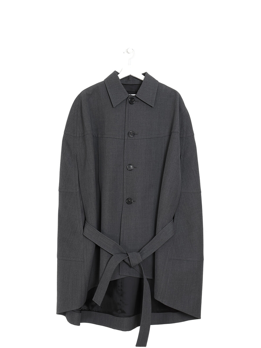 Rounded short sleeve cape coat in grey. Classic collar. Button-up closure at the front. Tie band at the waist.