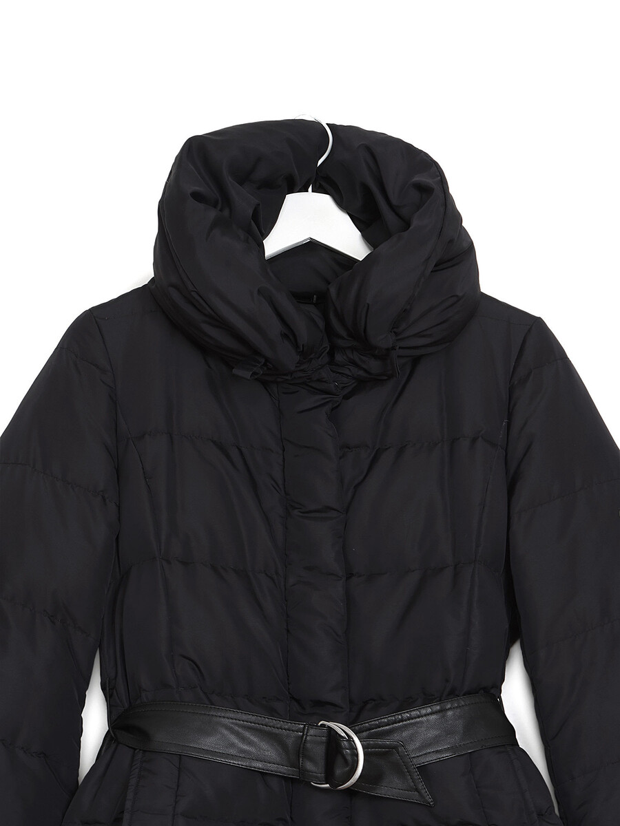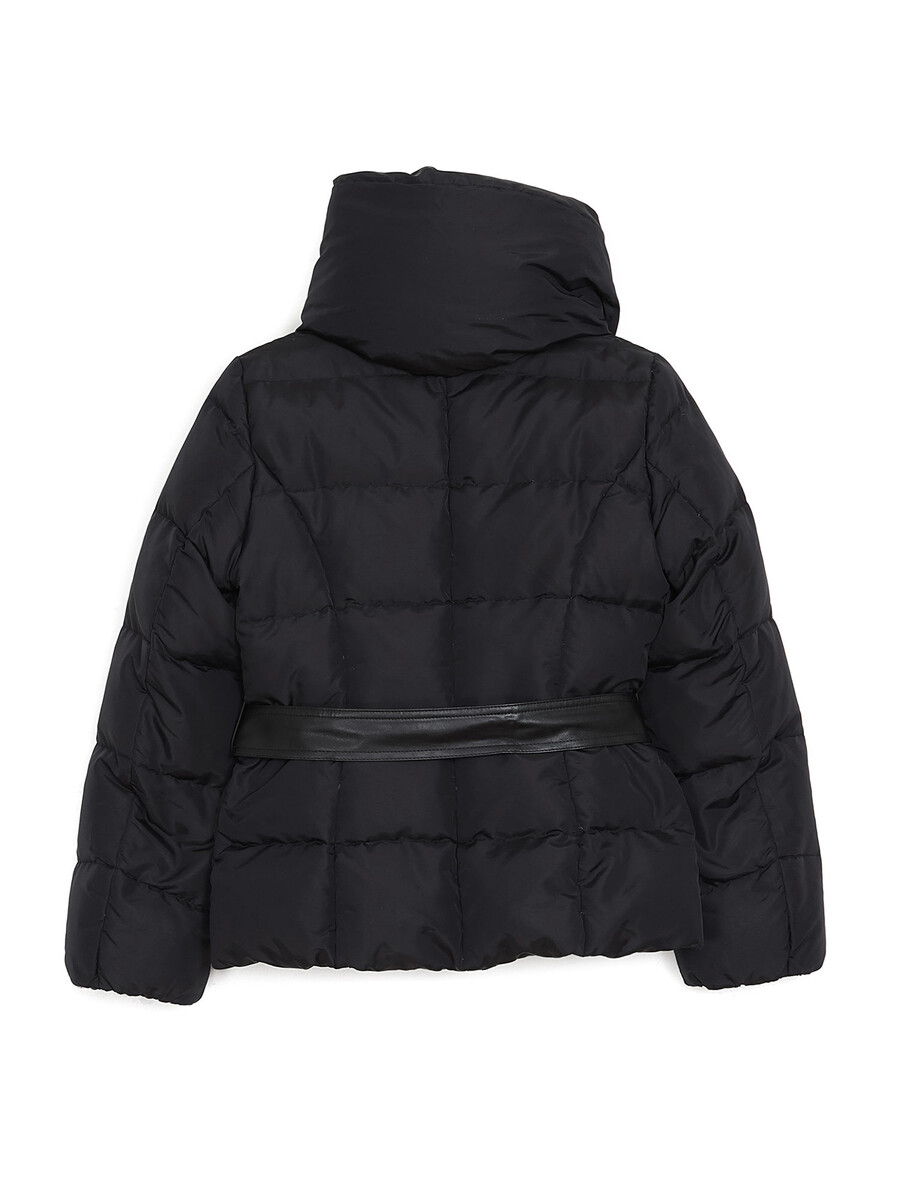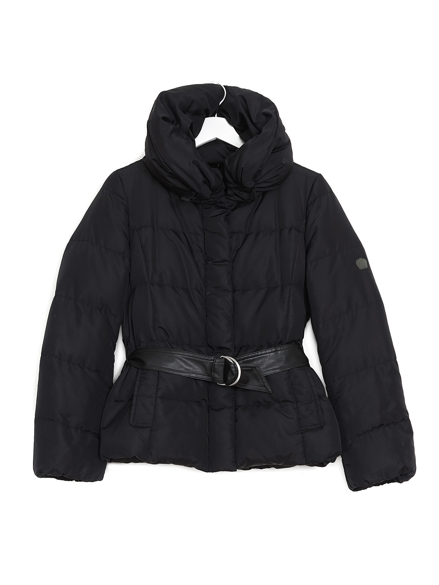 Quilted coat with long sleeves, a stand-up collar, and a front zip closure. Removable leather belt. Patch pockets with buttoned flaps. Polyester outer shell with down filling.