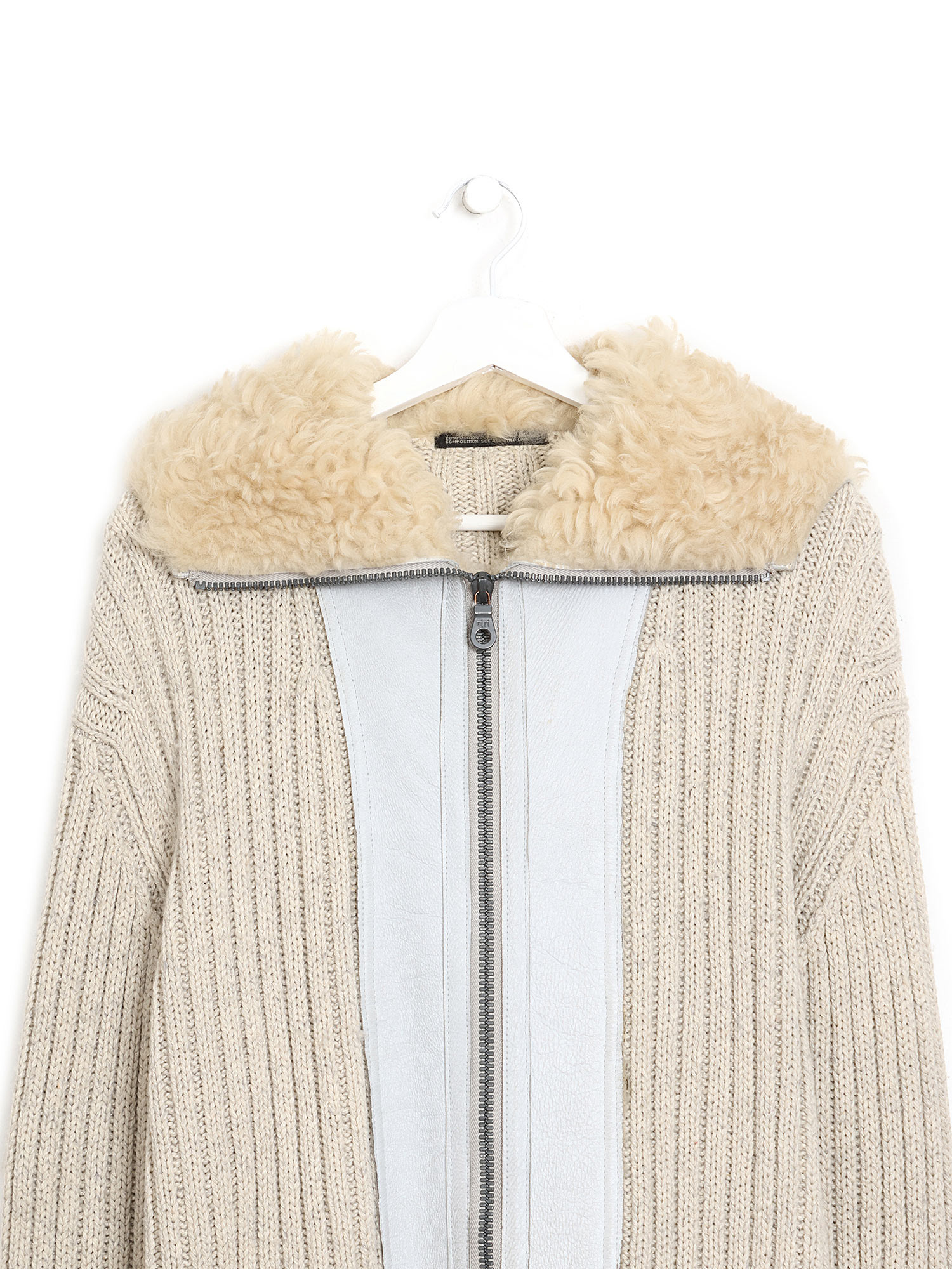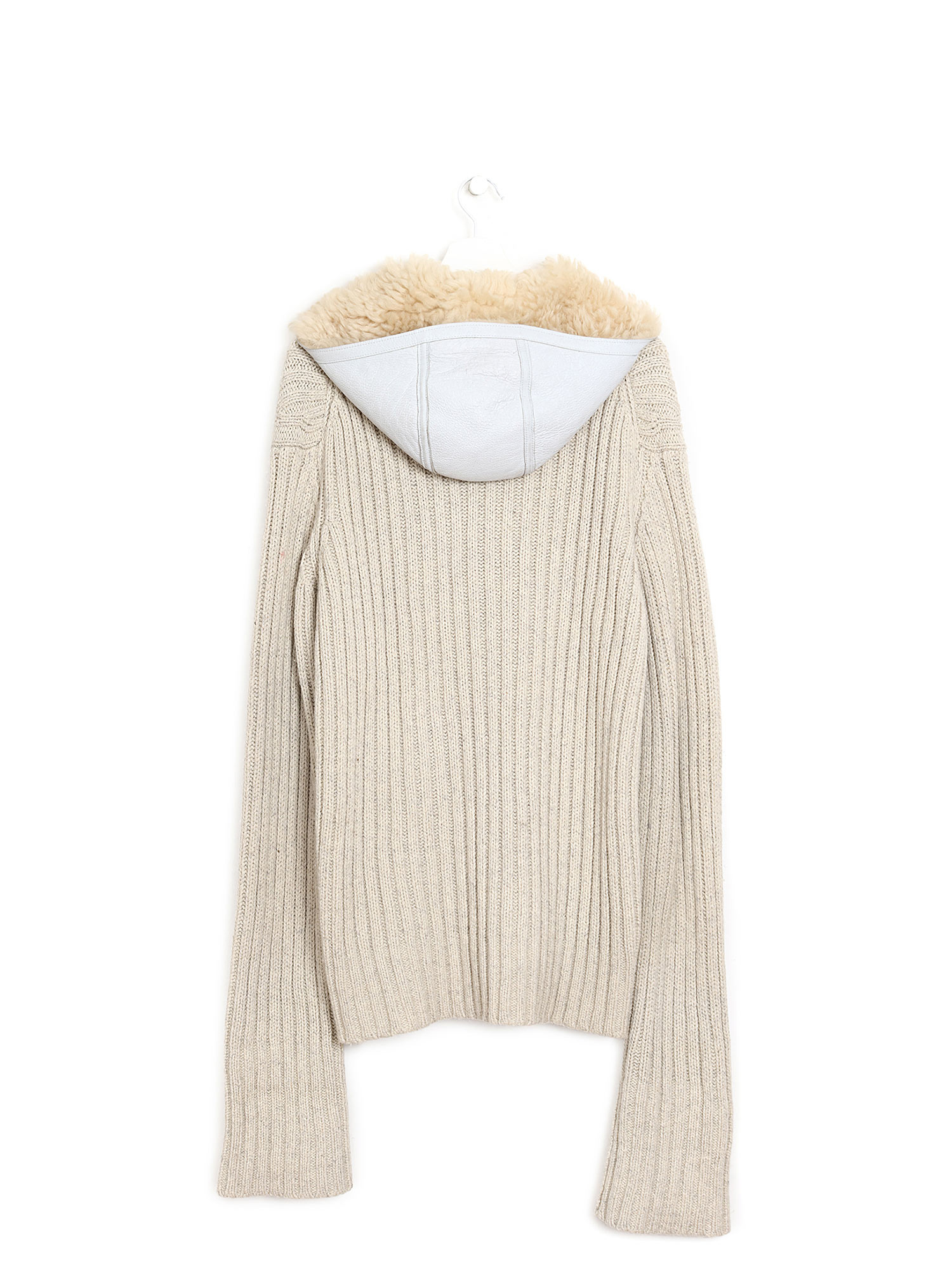 Rib-knit hooded cardigan in cream with shearling lining. Fur trim detailing around the reverse collar. Steel-grey metal zip closure.