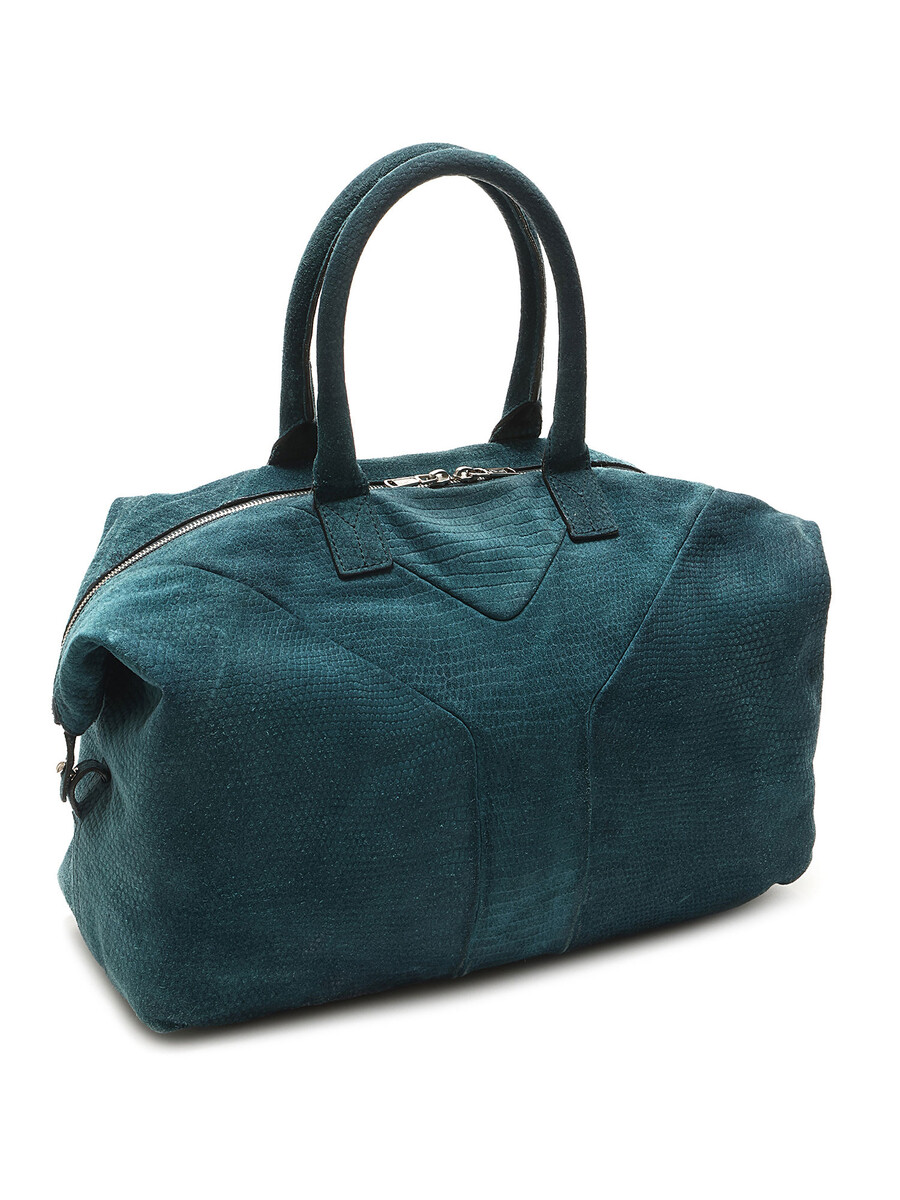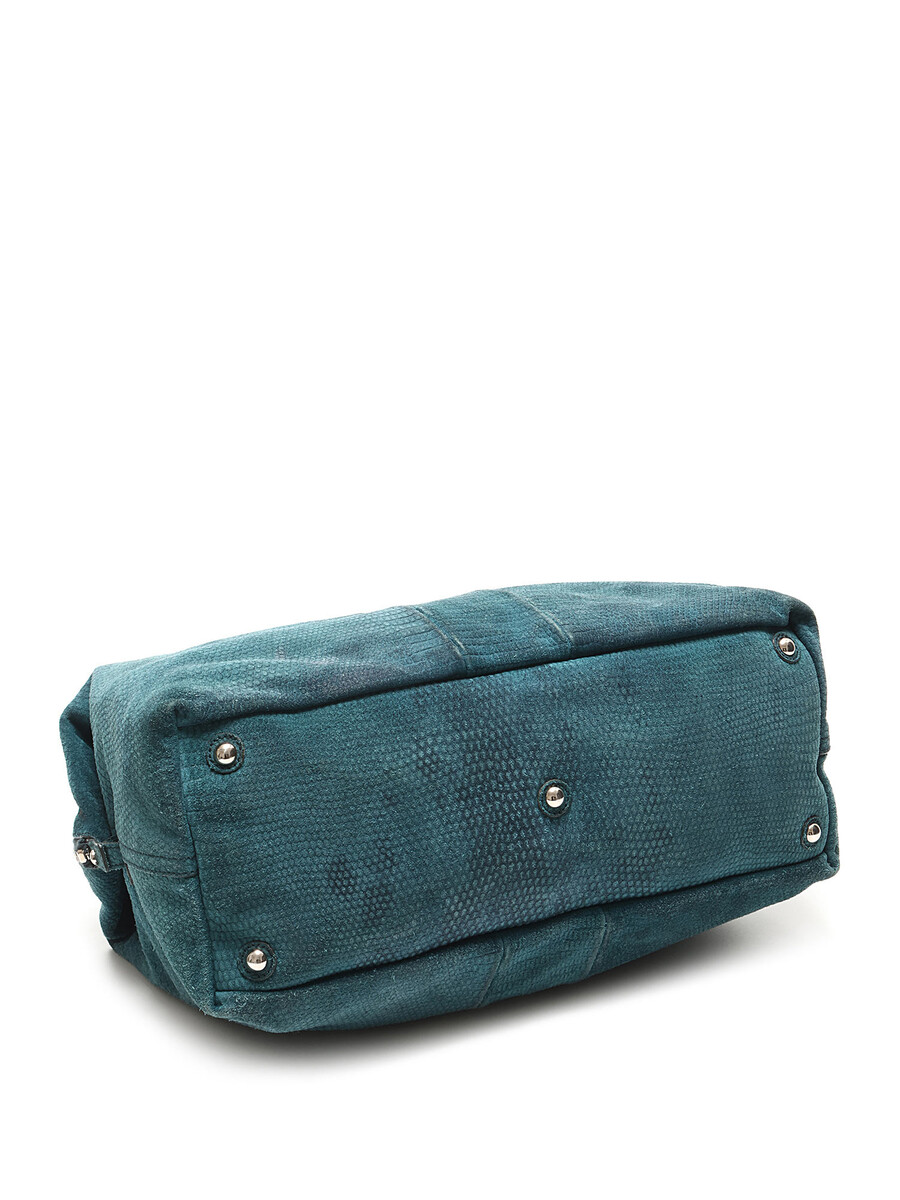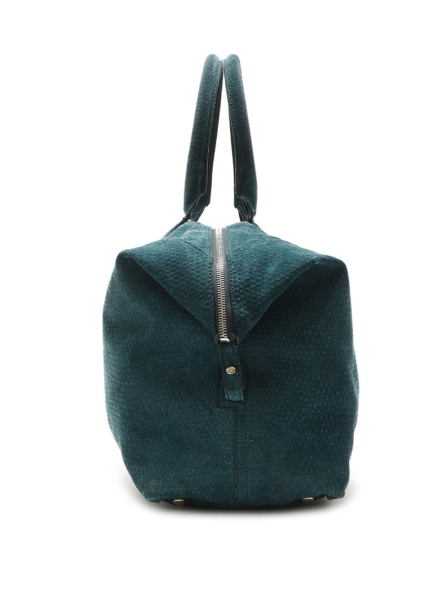 Textured suede hobo bag in teal with zipper closure. Rounded fixed handles. Silver-tone hardware.