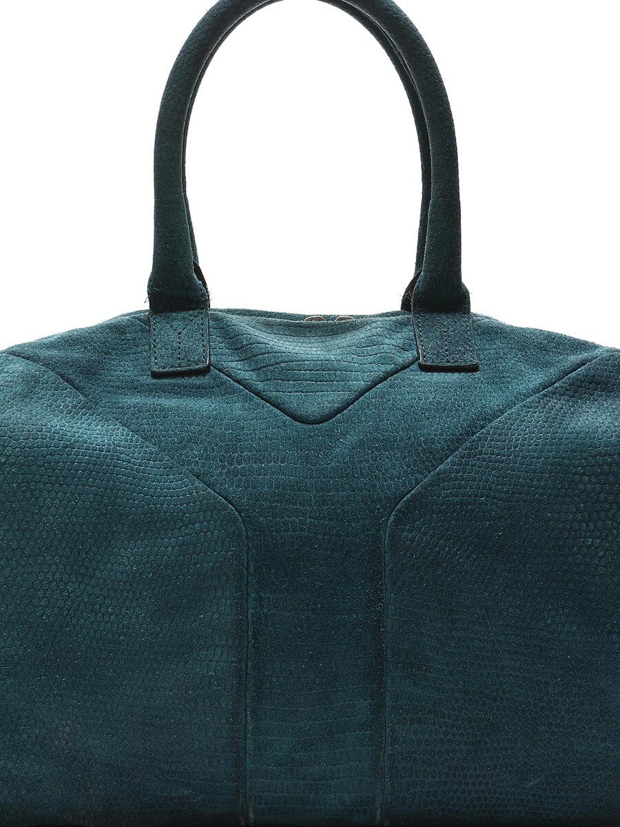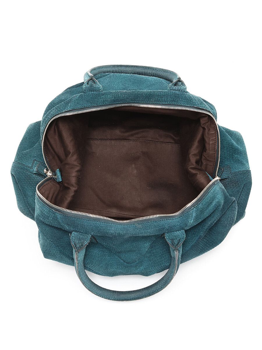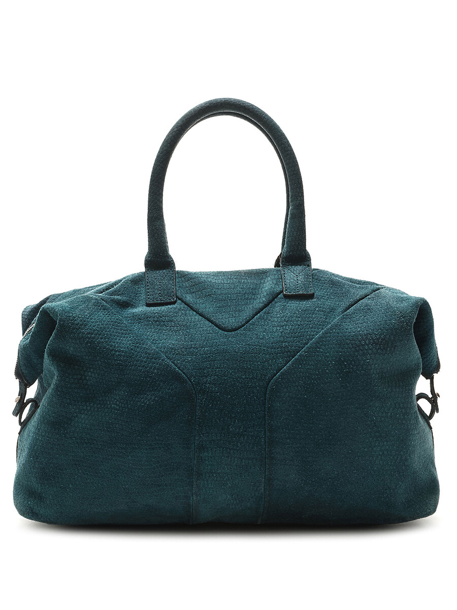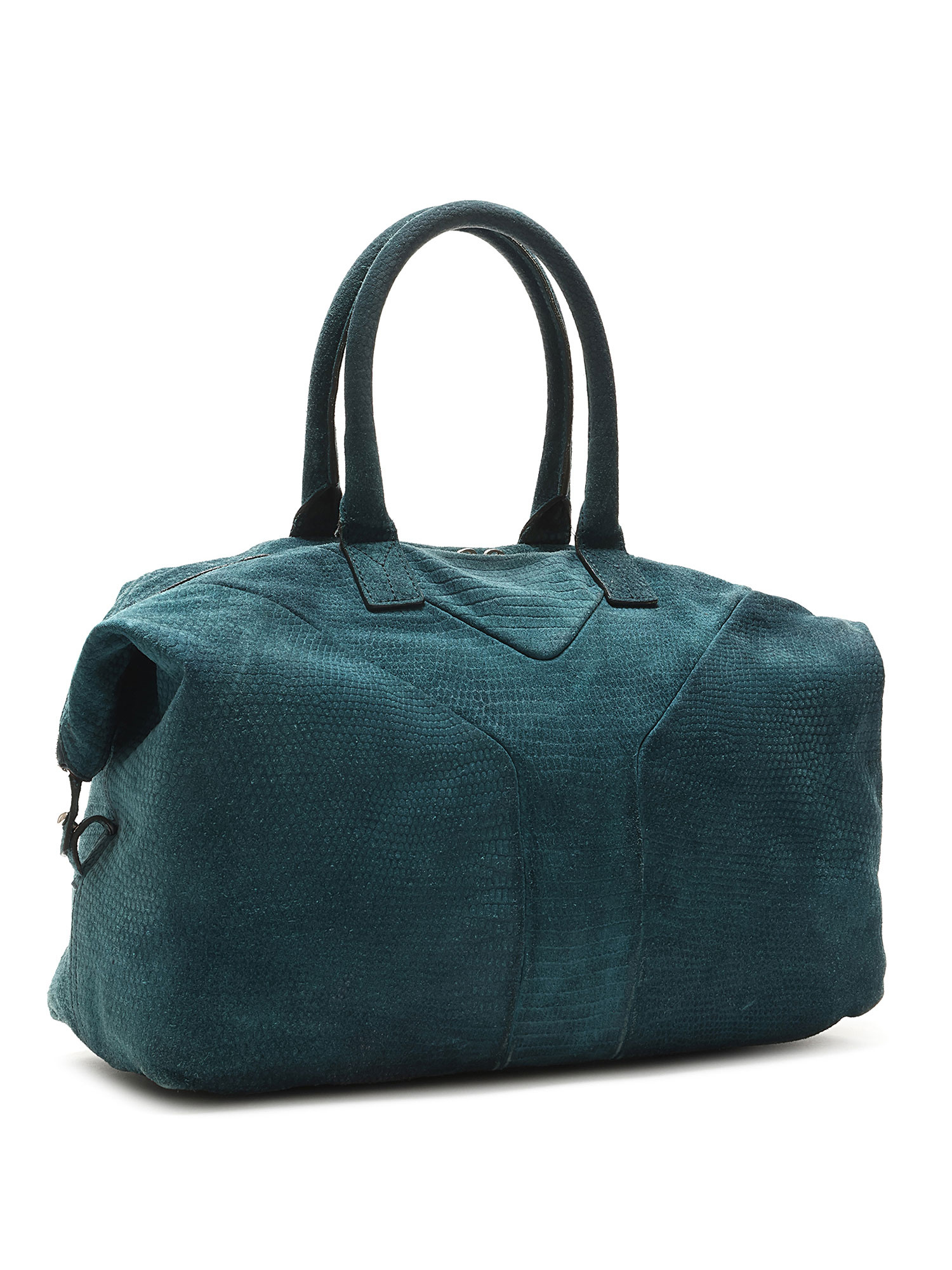 Textured suede hobo bag in teal with zipper closure. Rounded fixed handles. Silver-tone hardware.