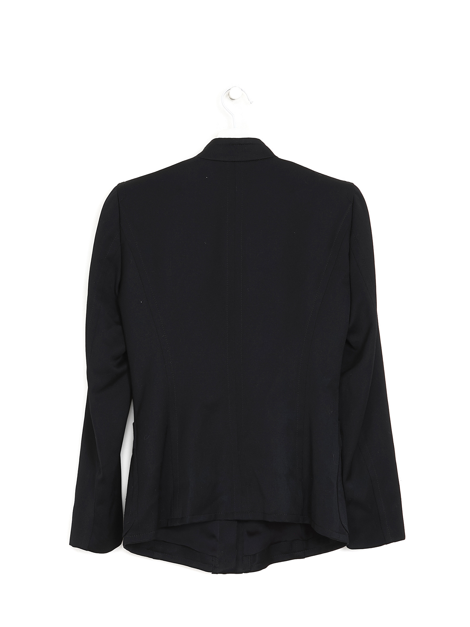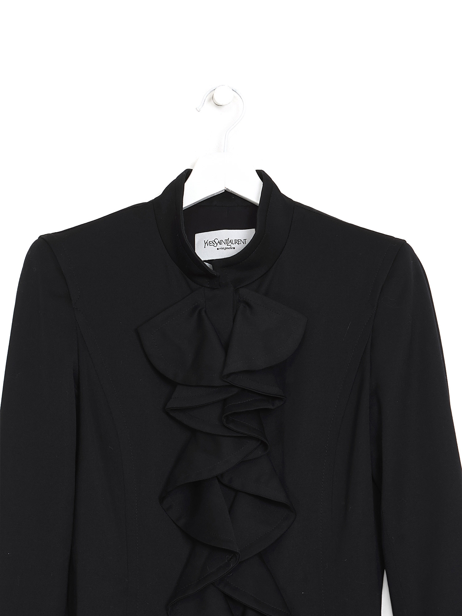 Long sleeve blouse with ruffle details in black. Button-down front closure. Shirt collar.
