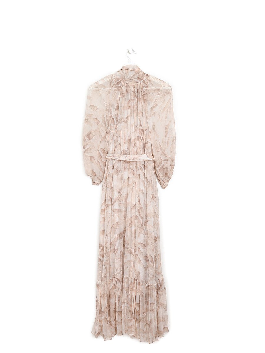 Silk dress with lining. Long sleeves with an abstract pattern. Belt closure with a bamboo-effect finish.